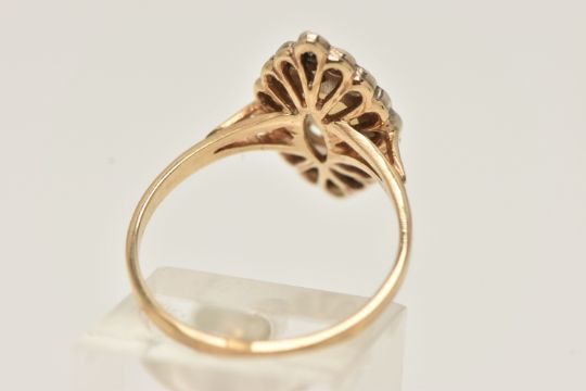 A 9CT GOLD OPAL AND DIAMOND CLUSTER RING, of a marquise form, set to the centre with an oval cut white opal cabochon, in an eight claw setting, to the surround of brilliant cut diamonds, trifurcated shoulders leading onto a polished band, hallmarked 9ct Birmingham, ring size O 1/2, approximate gross weight 3.0 grams (condition report: overall condition good)