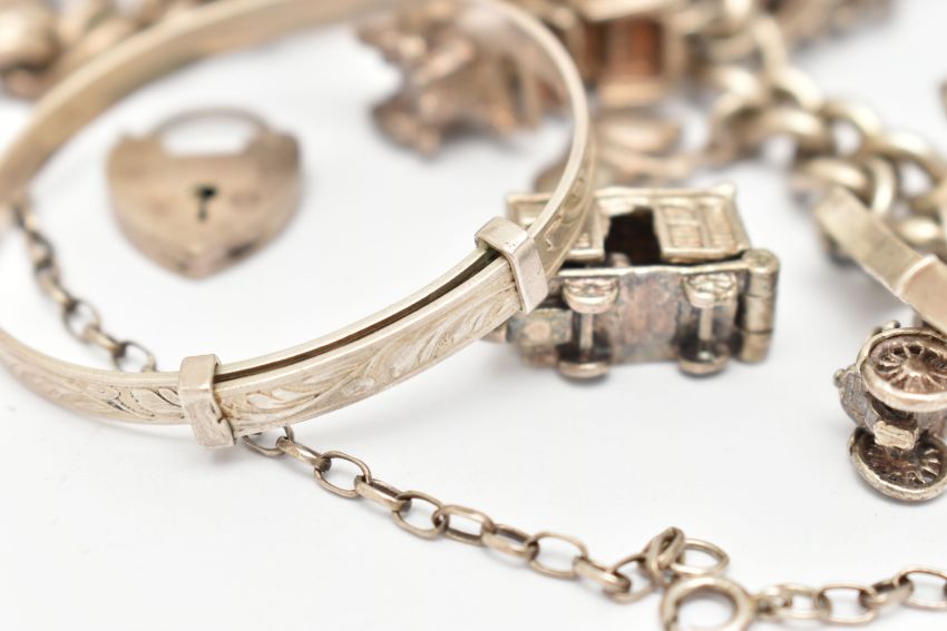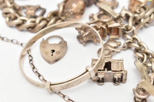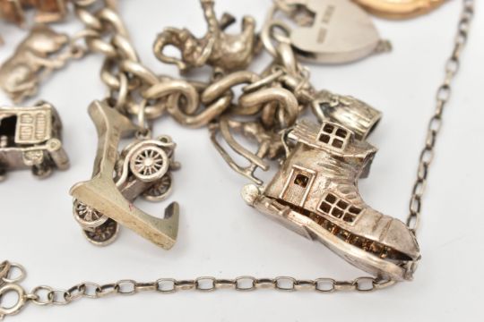 TWO SILVER CHARM BRACELETS, the first a silver curb link chain, fitted with a heart padlock clasp, hallmarked Birmingham, fitted with sixteen white metal charms, also fitted with a yellow gold St Christopher charm, hallmarked 9ct London import, approximate gross weight of bracelet 92.1 grams, together with a second curb link bracelet, fitted with a heart padlock clasp, hallmarked Birmingham, fitted with five white metal charms, a loose white metal charm, a white metal heart padlock clasp, a silver christening bracelet, hallmarked Birmingham, a fine belcher chain, fitted with a spring clasp, approximate chain length 480mm, approximate gross weight 75.6 grams (condition report: general moderate wear, overall condition good)