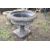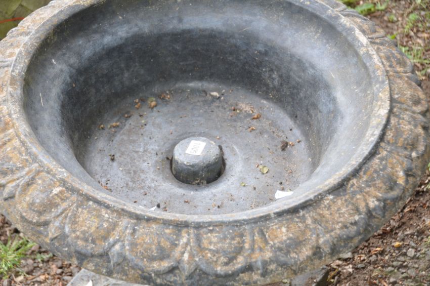 A MODERN COMPOSITE BALUSTERED GARDEN URN with a square fluted and tapered base and 64cm diameter bowl with egg and dart detail to top edge