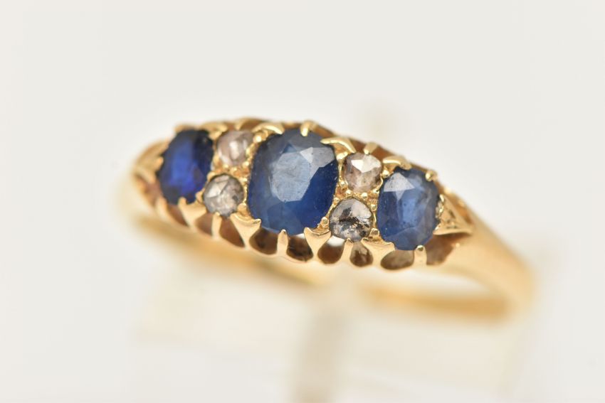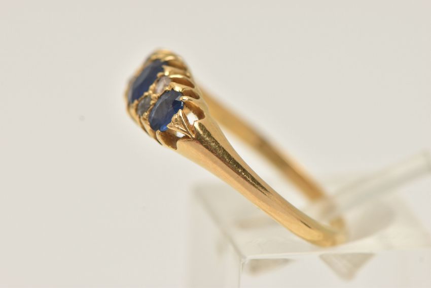 A YELLOW METAL GEM SET RING, set with three oval cut blue sapphires, and four rose cut diamonds, open work gallery, leading onto a polished band, stamped 18ct, ring size P, approximate gross weight 3.5 grams (condition report: general light wear)