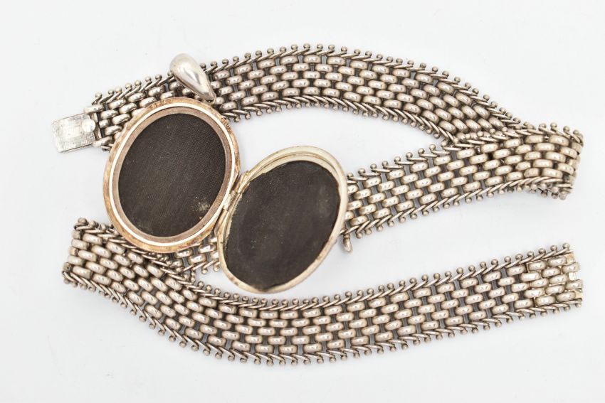 A LOCKET AND COLLAR, the oval locket with applied scrolling monogram, engraved detail to the edge, together with a brick link collar with beaded edging and push piece clasp, approximate length of locket 55mm, approximate length of collar 420mm, approximate total weight 90.3 grams