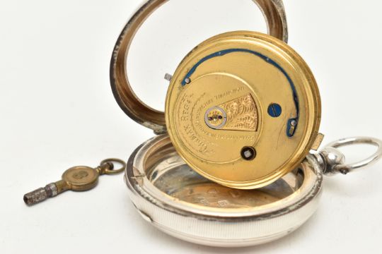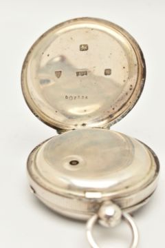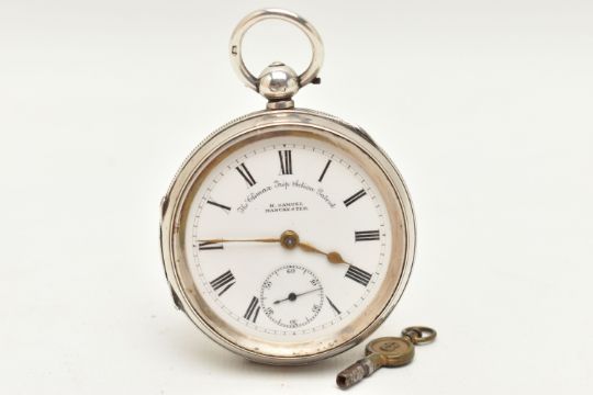 AN EARLY 20TH CENTURY SILVER OPEN FACE POCKET WATCH, key wound, round white dial signed 'The Climax Trip Action Patent, H.Samuel Manchester', Roman numerals, subsidiary dial at the six o'clock position, worn engine turned pattern with vacant cartouche, inside case back hallmarked 'H Samuel Ltd' Chester 1900, stamped 507334, approximate case width 54.7mm, approximate gross weight 135 grams, together with watch key (condition report: watch movement is free from case, the dust cover is stuck and will require some attention, watch is ticking at time of cataloguing although time keeping has not been tested, we cannot guarantee the working order of an watch)