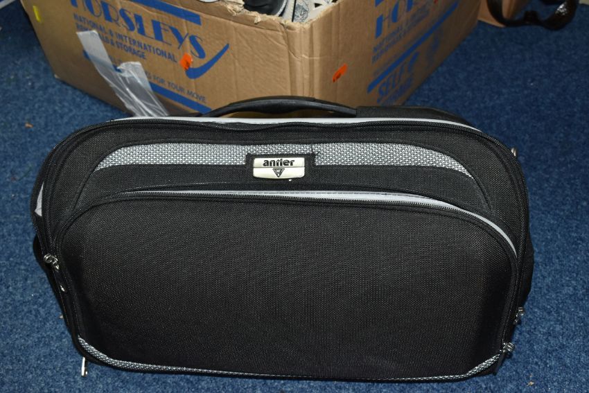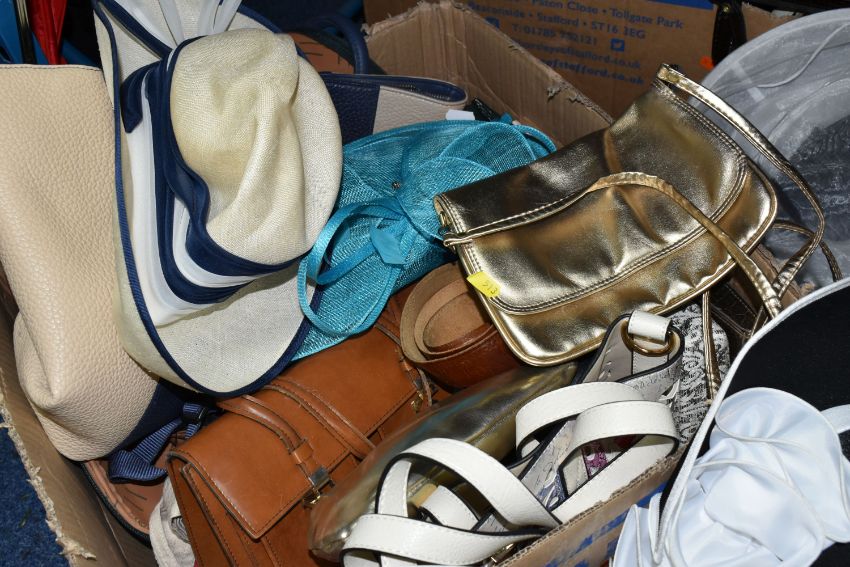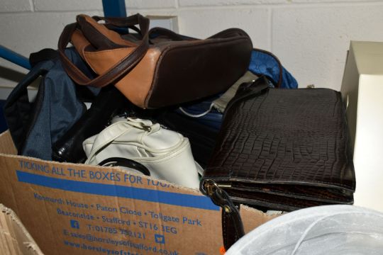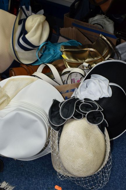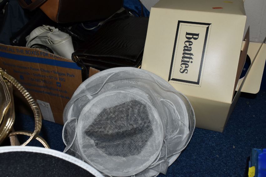 TWO BOXES AND LOOSE WOMEN'S ACCESSORIES to include assorted handbags, clutch bags, a blue fascinator, five vintage hats and a Beatties hat box, a quantity of belts (2 boxes and loose) (s.d)