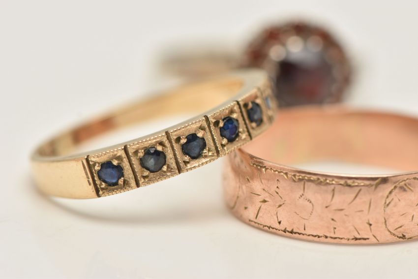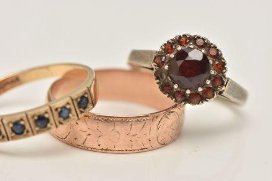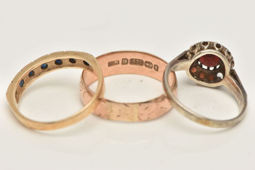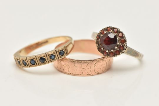 A SELECTION OF THREE RINGS, to include a sterling silver garnet cluster ring (AF), hallmarked sterling silver Birmingham 1975, ring size N, together with a 9ct gold sapphire seven stone ring, hallmarked Birmingham 1985, ring size Q, and a late Victorian 9ct gold wedding band, hallmarked Birmingham 1893, ring size S, weight of two 9ct gold rings (excluding silver ring) approximately 5.42 grams (condition report: good to fair, garnet missing to cluster ring, sapphire dark to seven stone ring, engraved detail to wedding band worn, band is off round and worn a little thin, in keeping with age)