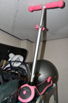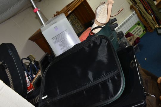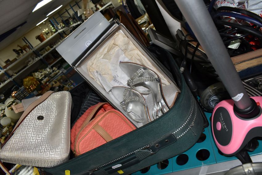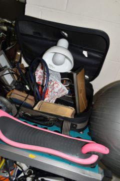 TWO SMALL SUITCASES AND LOOSE SUNDRIES, to include a 65cm RBK exercise ball, a pair of Pied á Terre diamanté evening shoes, white desk lamp, three photo frames, a Samsung T.V model LE19R71B (untested), a child's pink and grey John Lewis scooter, a boxed BaByliss pivotal beard trimmer and three antiquarian books, etc. (s.d) (2 suitcases + loose)