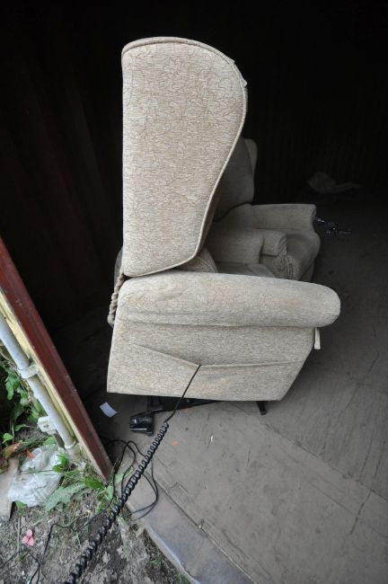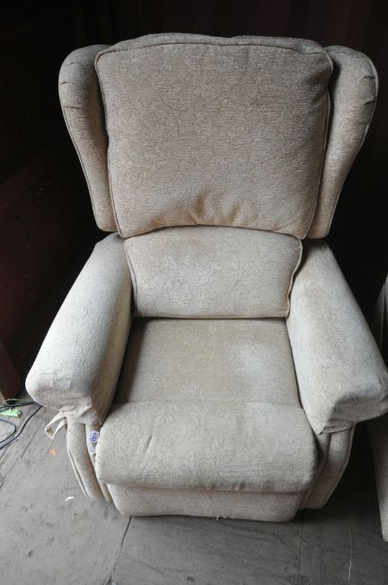 A PAIR OF BEIGE FLORAL UPHOLSTERED RISE AND RECLINE ARMCHAIRS (condition report: both PAT pass and working, in need of a clean, other general signs of wear and usage) (2)