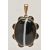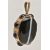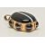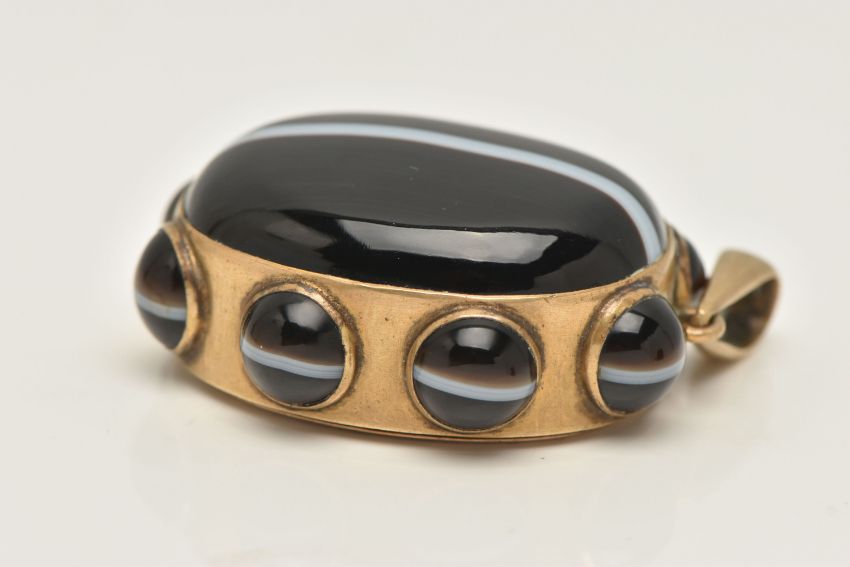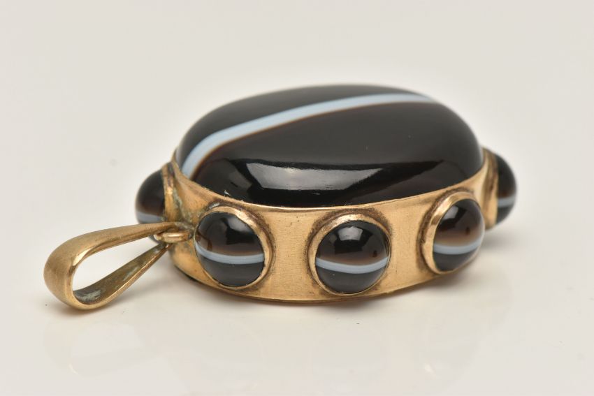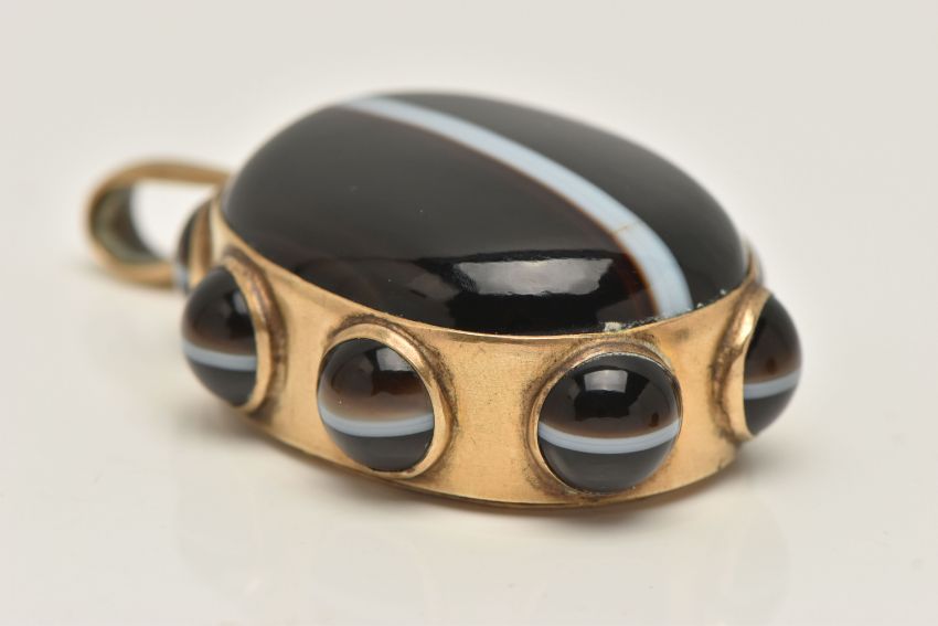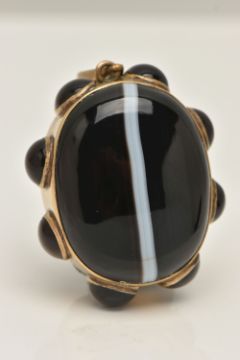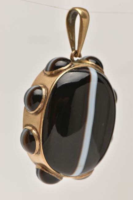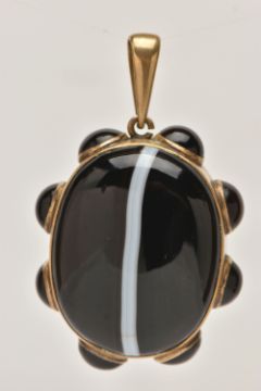 A LARGE BANDED AGATE MOURNING PENDANT, a large brown and white banded agate oval cabochon, collet set in a yellow mount with a surround of eight circular banded agates each in a collet setting, vacant hair/photo compartment to the reverse, missing glass cover, fitted with a large tapered bail, unmarked, length including bail 65mm (condition report: general light wear, would benefit from a gentle clean and polish, compartment to the reverse will require some attention)