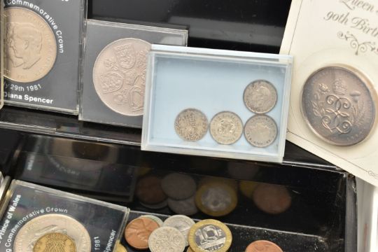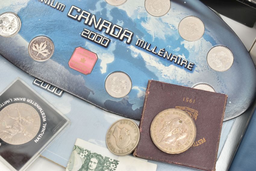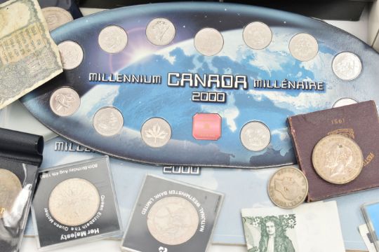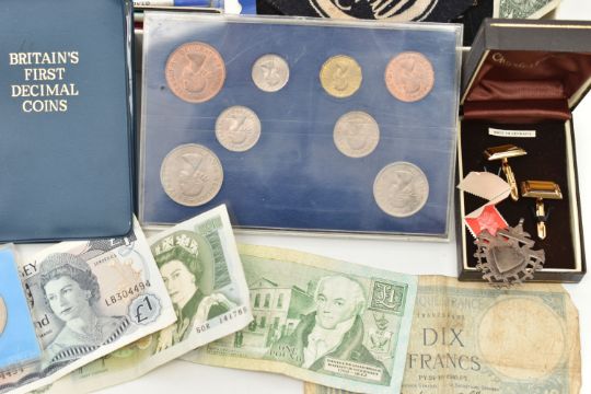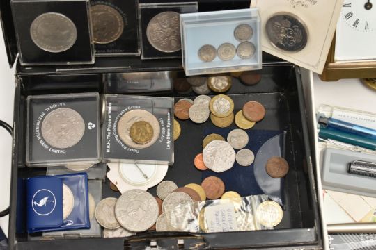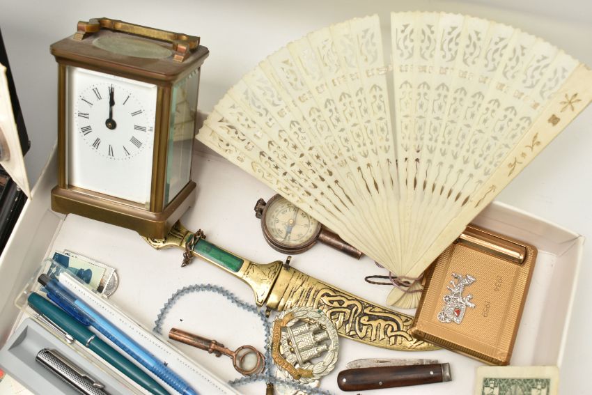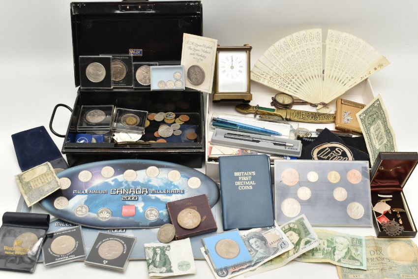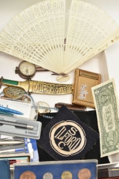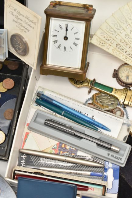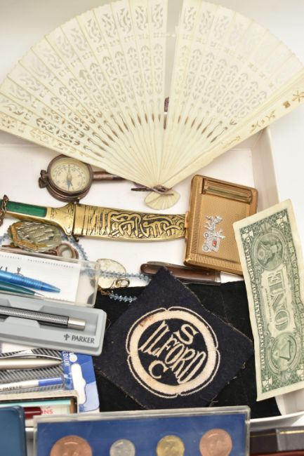 A BOX OF ASSORTED ITEMS, to include a silver fob medal, with vacant cartouche, hallmarked Birmingham, approximate gross weight 12.2 grams, a boxed 'Parker 17 Lady' fountain pen, a 'Parker' ball point, refills, a Kigu compact, a novelty dagger, compass, boxed cufflinks, a carved bone fan, and a base metal carriage clock, together with a metal tin of mixed coinage including a George V, 1935 Crown coin, a boxed 'Festival of Britain 1951' Crown coin, commemorative coins, loose coinage and banknotes etc