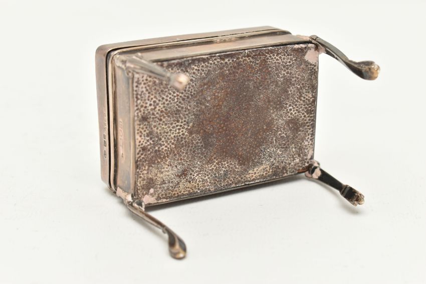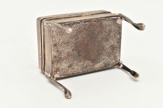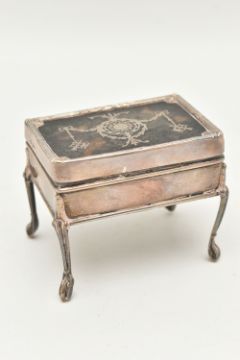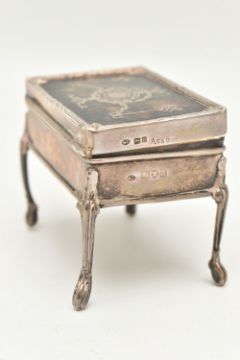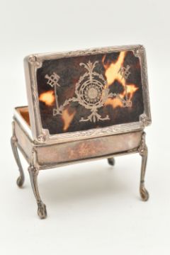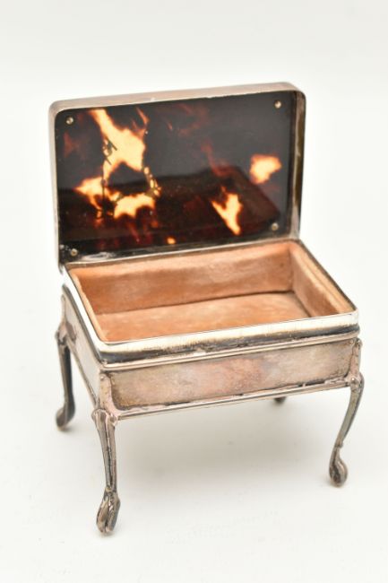 AN EARLY 20TH CENTURY SILVER TORTOISESHELL BOX, of a rectangular form, the hinged cover with tortoiseshell pique decoration, fabric interior, raised on four cabriole legs, hallmarked 'William Comyns & Sons' London 1908, approximate height 60mm, approximate gross weight 82.2 grams, 2.64 ozt (condition report: general wear in keeping with age, would benefit from a gentle clean and polish, does not sit flush)