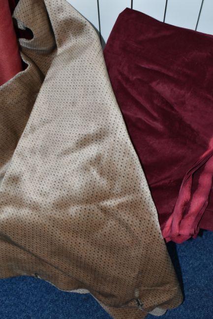 ONE BOX AND LOOSE ROLLS OF UPHOLSTERY FABRIC AND TEXTILES, comprising ten assorted rolls of fabric, comprising burgundy velvet, pale blue leather, black lining, red PVC, brown satin, grey checked, etc. (s.d) (1 box + loose rolls)