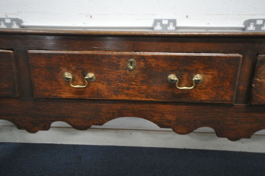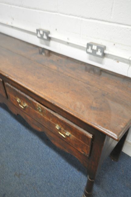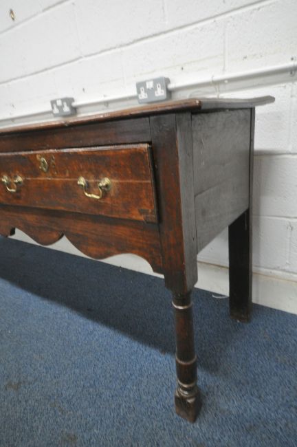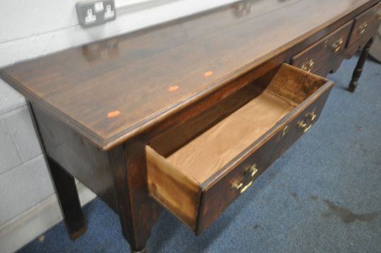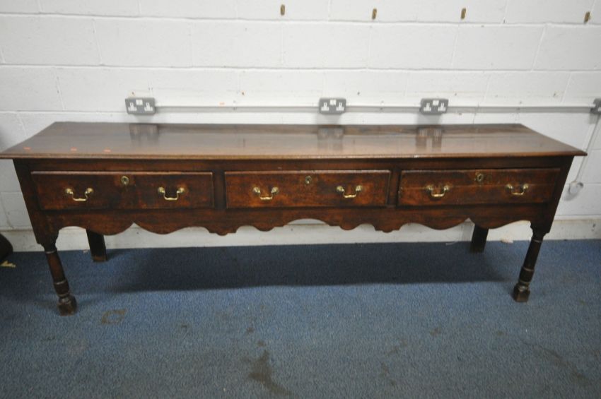 A GEORGIAN OAK DRESSER BASE, with three frieze drawers, a wavy apron, raised on block and turned legs, length 236cm x depth 50cm x height 82cm (condition report: historical wear and usage, such as marks, scuffs, stains, splits, alterations, other imperfections)
