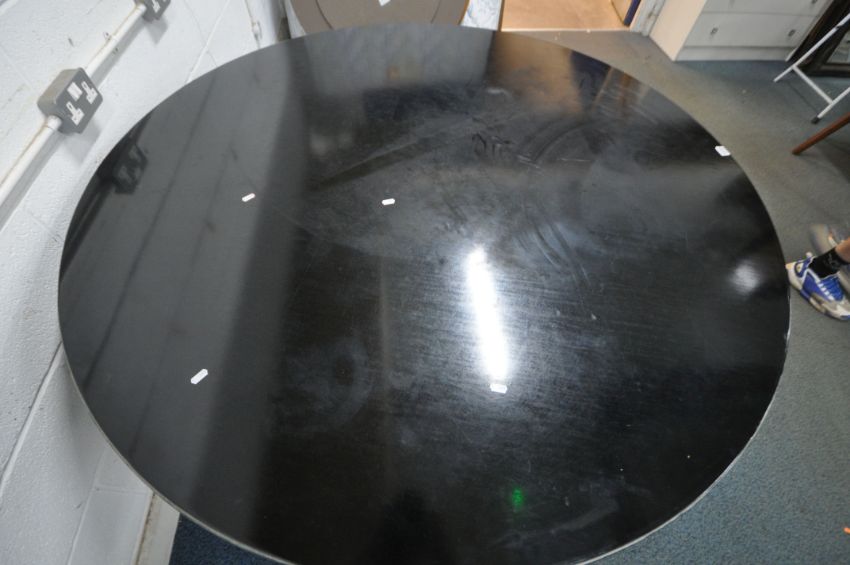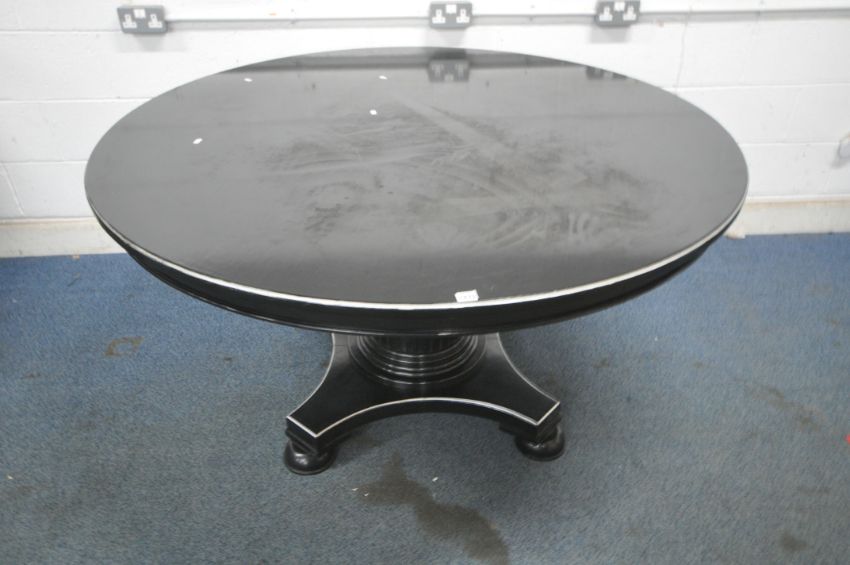 A LARGE EBONISED CIRCULAR DINING TABLE, on a cylindrical pillar, shaped base on bun feet, diameter 151cm x height 80cm (condition report: marks, scuffs, slight discoloration, other signs of usage)