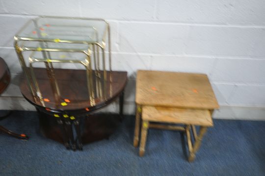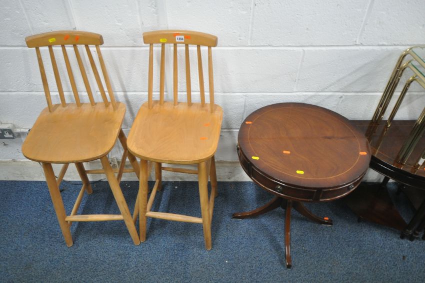A PAIR OF BEECH HIGH CHAIRS, a mahogany drum table with two drawers, a demi-lune nest of three tables, a nest of two tables, and a tubular metal nest of three tables, with glass tops (condition report: all with general signs of wear and usage) (6)