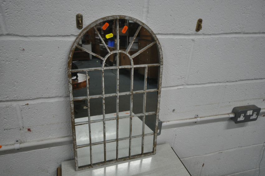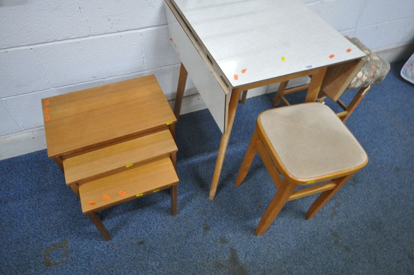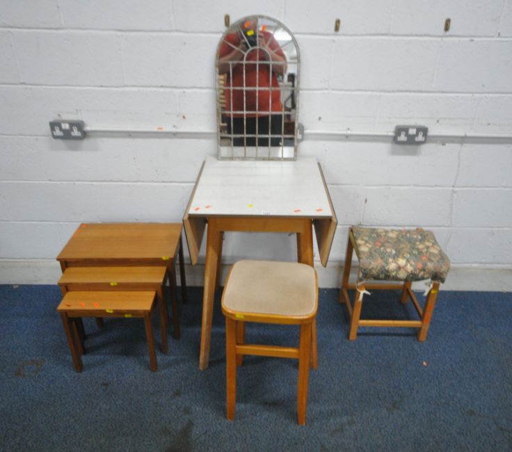 A FORMICA DROP LEAF TABLE, two stools, a wall mirror and a nest of three tables (condition report: marks, scuffs, other wear and usage) (5)