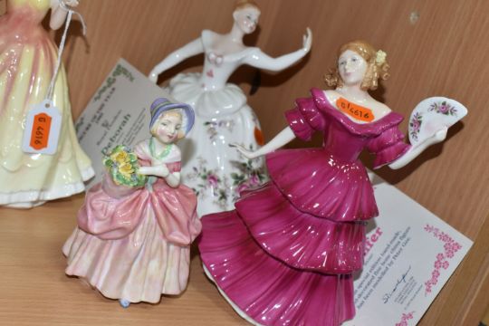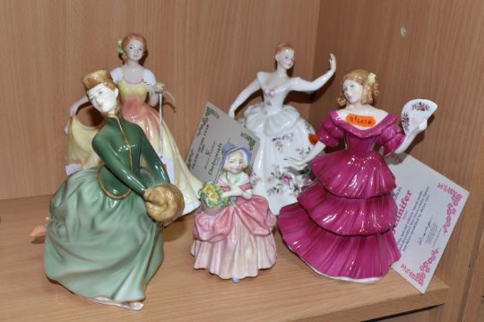 FIVE ROYAL DOULTON FIGURINES, comprising Grace HN2318, Deborah Figure of the Year 1995 HN3644 with certificate (hairline around right hand), Cissie HN1809 (tiny loss to one petal), Jennifer Figure of the Year 1994 HN3447 with certificate, and Shirley HN2702 (5 + 2 certificates) (Condition Report: most figures appear in good condition, obvious specific damage as stated in description)