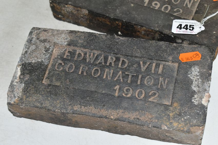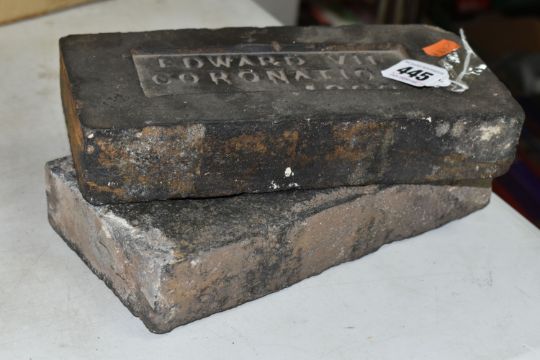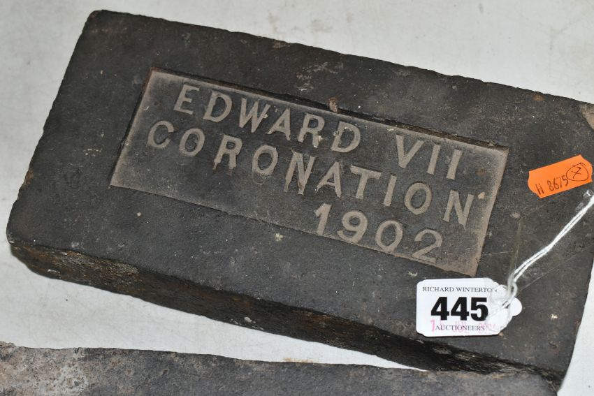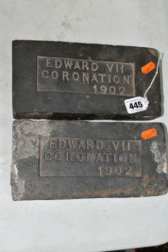 A PAIR OF COMMEMORATIVE CORONATION BRICKS FOR EDWARD VII with the inscription Edward VII Coronation 1902 (2) (Condition Report: visible chips and plaster marks to both bricks)