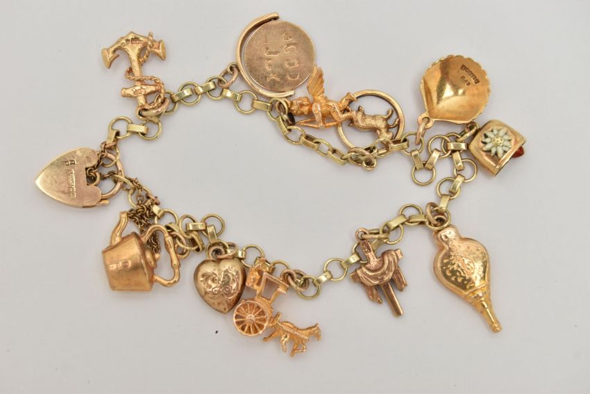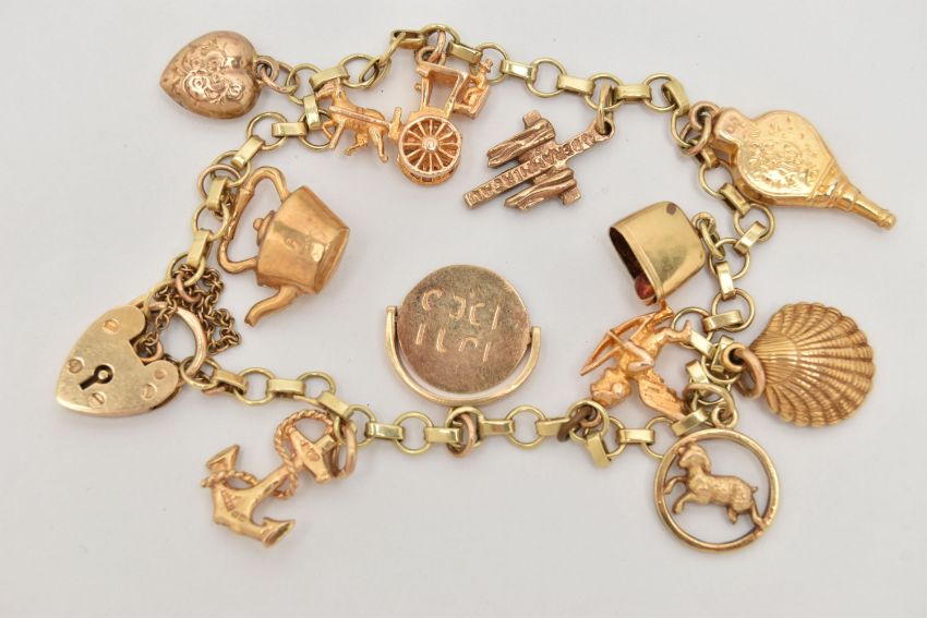 A 9CT GOLD CHARM BRACELET, fine bracelet, fitted with a heart padlock clasp, hallmarked 9ct Birmingham, with additional safety chain, fitted with eleven charms in forms such as a shell, bell, cross, cherub, puffy heart, anchor, horse and cart, etc most hallmarked 9ct gold, the cross stamped 333, the bell has a continental mark, approximate gross weight 16.3 grams, length of bracelet 180mm (condition report: general light wear, clasp in working order, overall condition good)