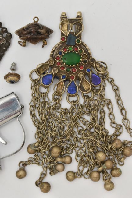 A SELECTION OF ITEMS, to include a pair of circular Delft earrings, a Flying Wing lighter shaped like a gun, a rose brooch, two further brooches, a part of a continental chatelaine etc
