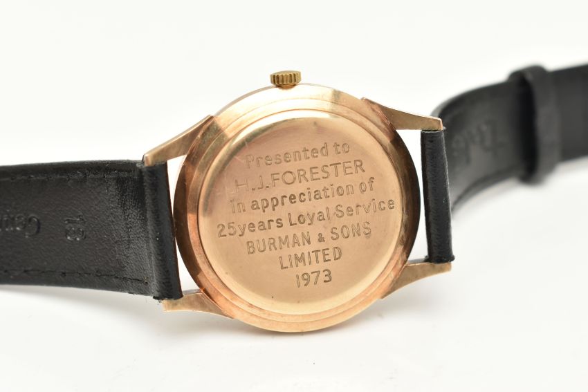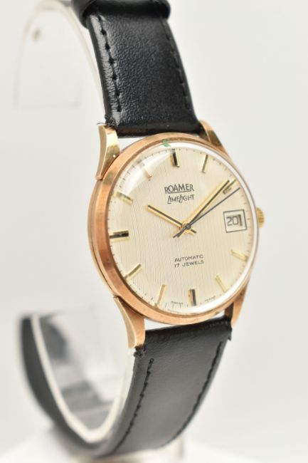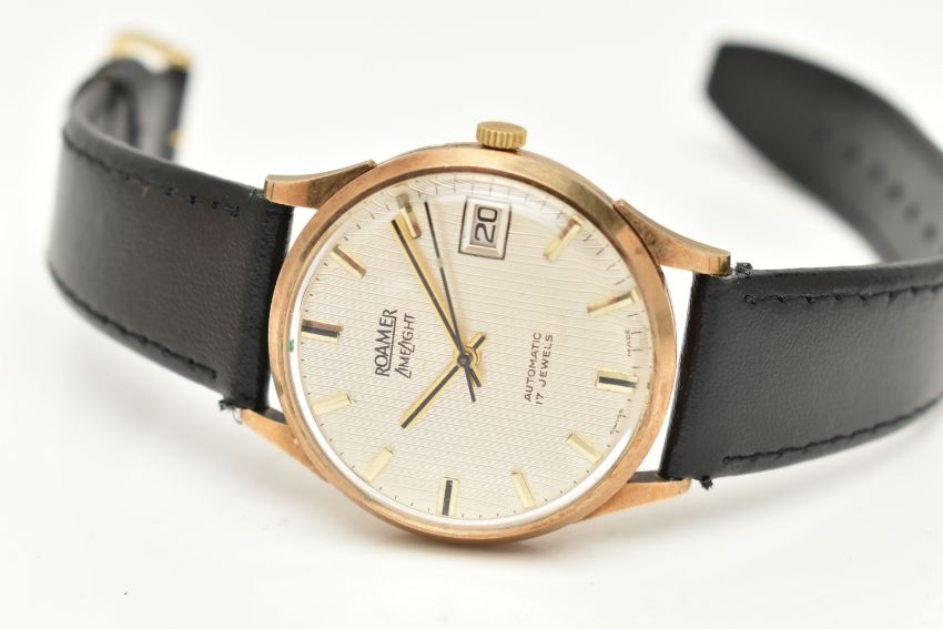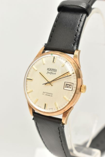 A GENTS 9CT GOLD 'ROAMER LIMELIGHT' WRISTWATCH, automatic movement, round silvered dial signed 'Roamer LimeLight', baton markers, date window at the three o'clock position, black hands, in a polished case, personal engraving to the case back reads 'Presented to H.J.Forester in appreciation of 25 Years Loyal Service Burman & Sons Limited 1973', approximate case width 32.7mm, inside case back stamped 'Stolkace British Made' rubbed 9ct hallmark for Birmingham 1973, movement signed 'Roamer Watch Co 17 jewels', fitted with a black strap and yellow metal ardillon buckle (condition report: requires attention, winding is stiff, non-running, scratch free case, strap appears new like, would benefit from a gentle clean and polish, we cannot guarantee the working order of any watch)