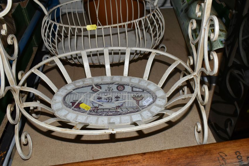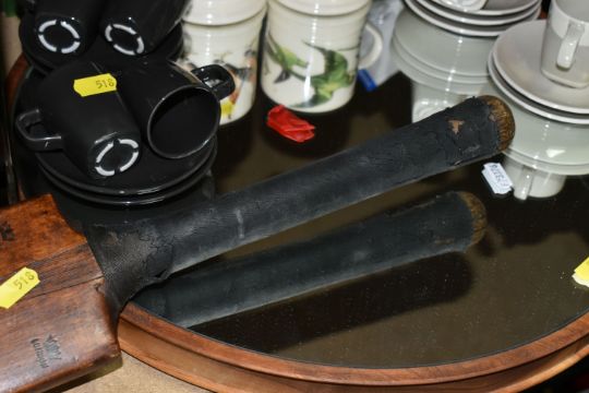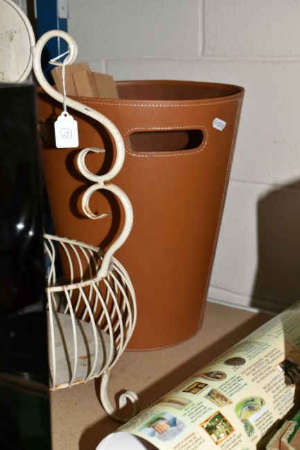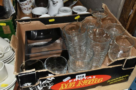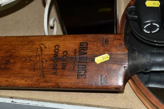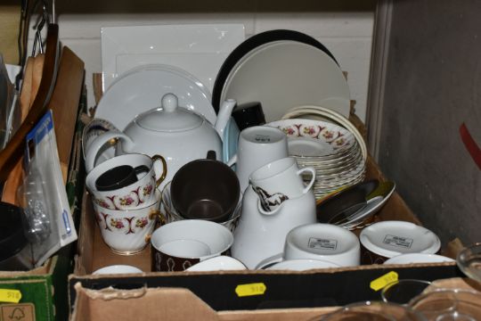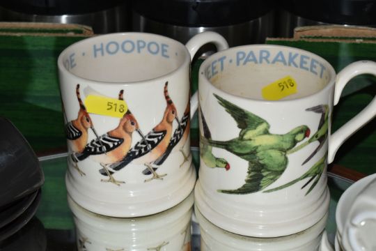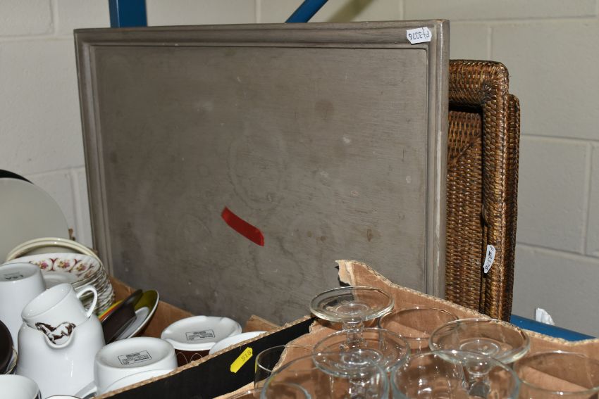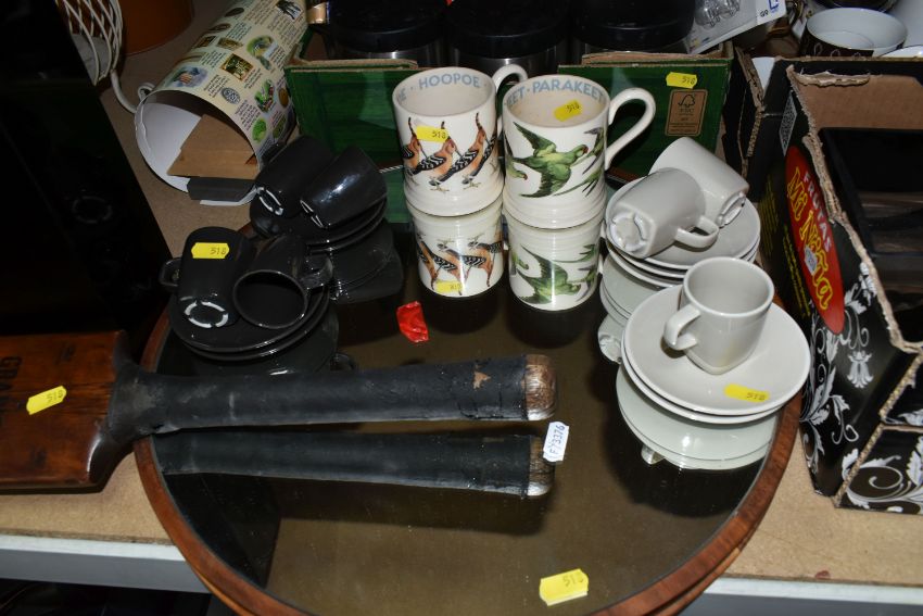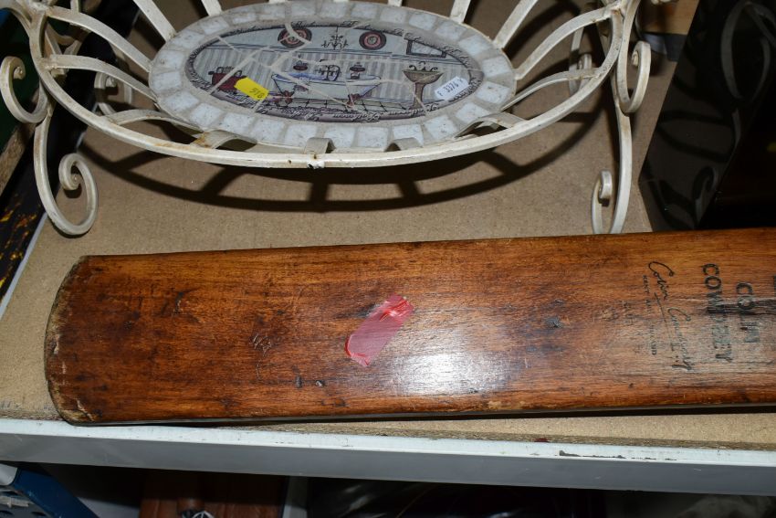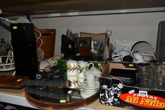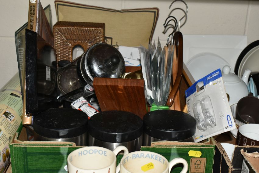 THREE BOXES AND LOOSE MIXED SUNDRIES to include a pair of Emma Bridgewater mugs featuring Hoopoe and Parakeet designs, a vintage Gradidge cricket bat, two boxes of mixed ceramics and glassware, a quantity of Ikea espresso cups and saucers, three cafetieres, a circular mirror, an artificial leather bin, two trays, etc (3 boxes and loose) (s.d)