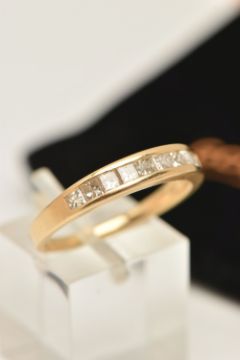 AN 18CT DIAMOND BAND RING, nine princess cut diamonds, channel set in yellow gold, estimated total diamond weight 0.70ct, clarity assessed as SI1, approximate band width 4mm, ring size S, approximate gross weight 4.6 grams (condition report: general moderate wear, overall condition good)