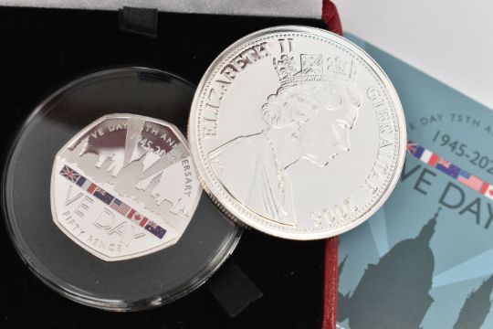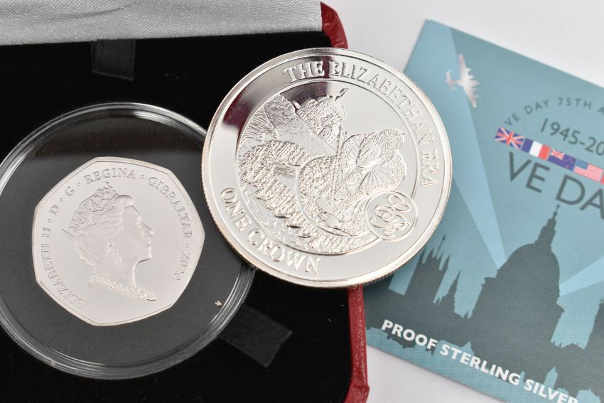 A VE DAY 50P SILVER PROOF COIN, 75th anniversary coin, together with box and 'Pobjoy Mint Ltd certificate, also including a silver plated one crown coin