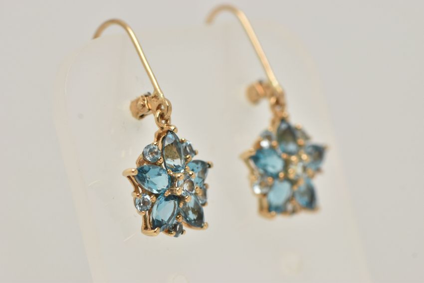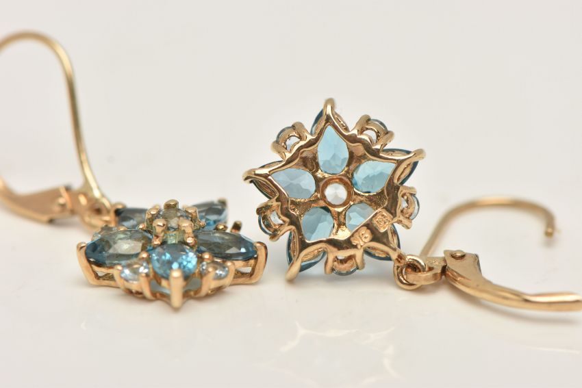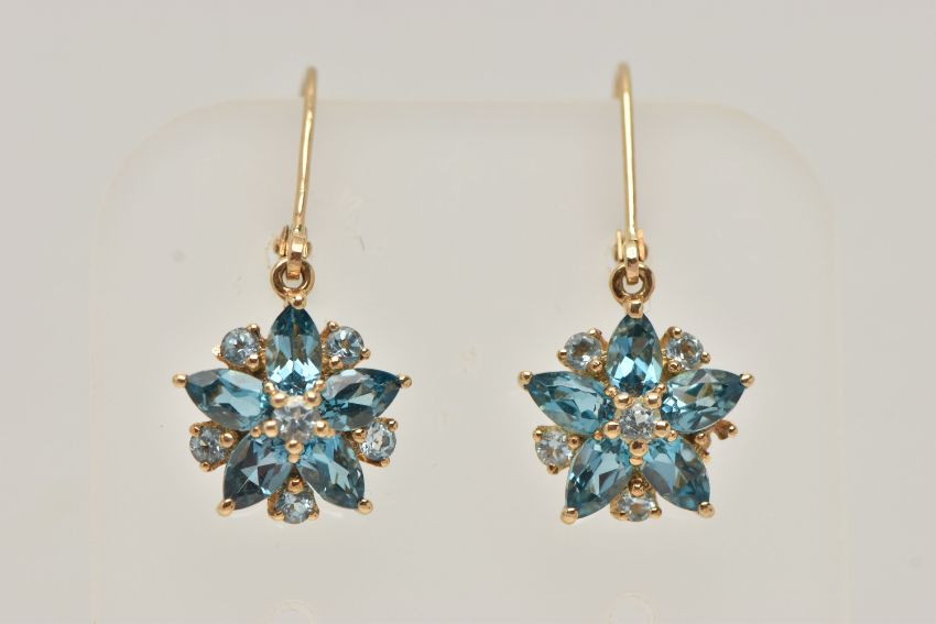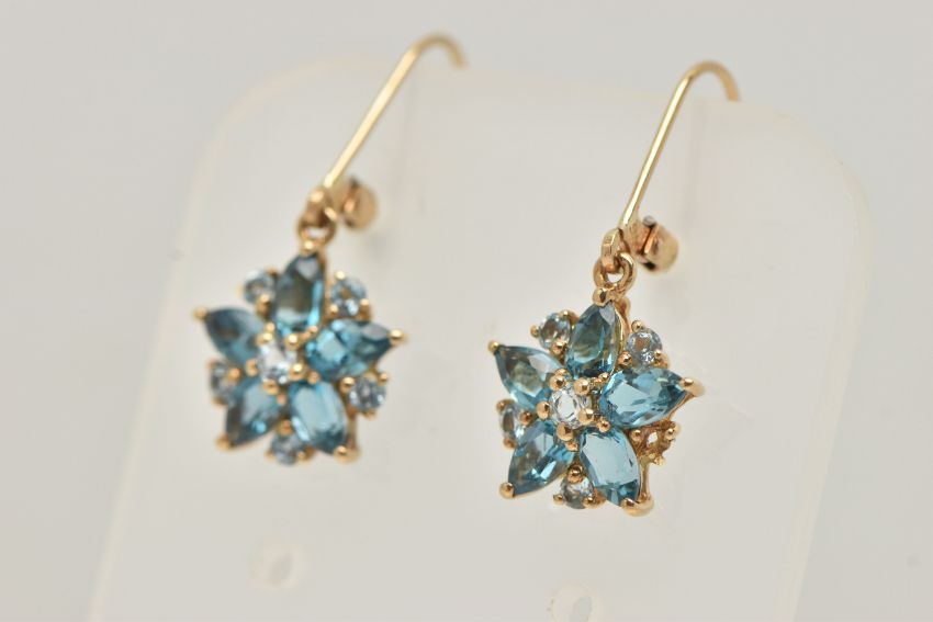 A PAIR OF YELLOW METAL BLUE TOPAZ FLOWER DROP EARRINGS, fish hook fittings, stamped 9k, drop length 30mm, approximate gross weight 2.4 grams