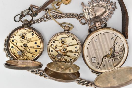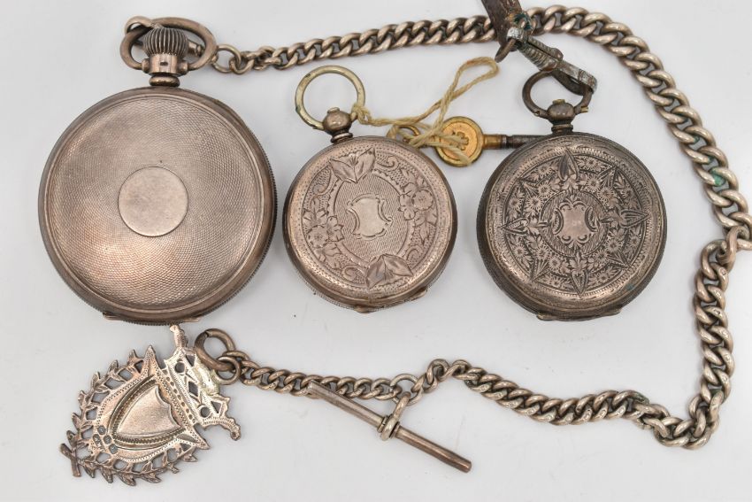 THREE POCKET WATCHES AND A SILVER ALBERT CHAIN, the first a manual wind, open face 'Smith' pocket watch, round cream Roman numeral dial signed 'Smith', subsidiary dial at the six o'clock position, within an engine turned pattern case with vacant cartouche, inside case back hallmarked 'Aaron Lufkin Dennison' Birmingham 1947, personal engraving to the dust cover reads 'Imperial Chemical Industries Ltd, Presented To E.A.Chiles for 25 Years Service 1945', approximate case width 50.6mm, fitted with a graduated silver Albert chain, each link stamped with a sterling mark, with T-bar, lobster clasp and a fob medal with vacant cartouche hallmarked Birmingham, length 330mm, approximate gross weight 155.3 grams, together with two smaller white metal, open face and key wound pocket watches, both with white Roman numeral dials, one with floral detail, each stamped with Swiss silver control marks, one fitted with a leather Albert the other with string and a key (condition report: watches have not been tested for working condition, we cannot guarantee the working order of any watch)