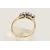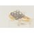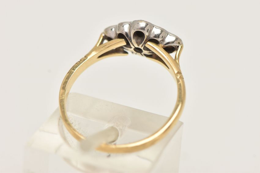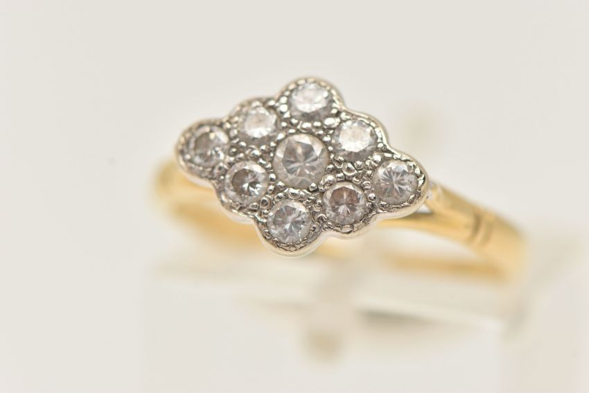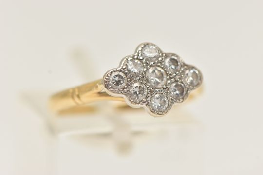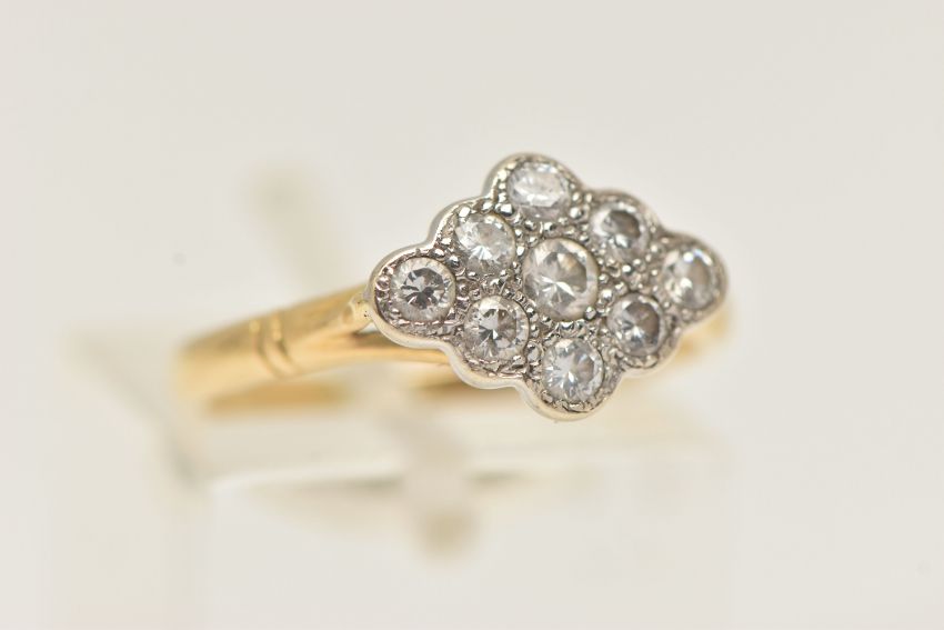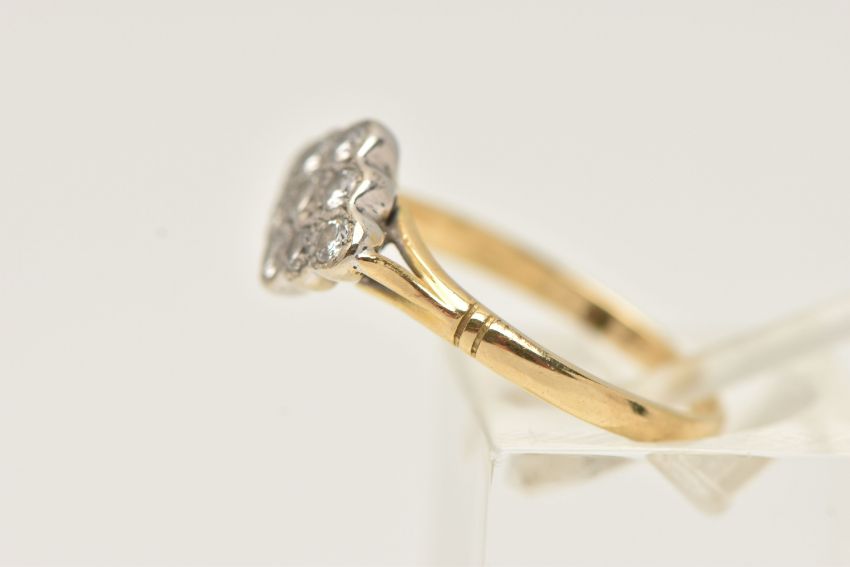 A YELLOW METAL DIAMOND RING, of a marquise shape set with nine round brilliant cut diamonds, estimated total diamond weight 0.35ct, in a white metal milgrain setting, to the trifurcated shoulders and polished band, very rubbed hallmark, ring size L, approximate gross weight 2.9 grams (condition report: overall condition good)