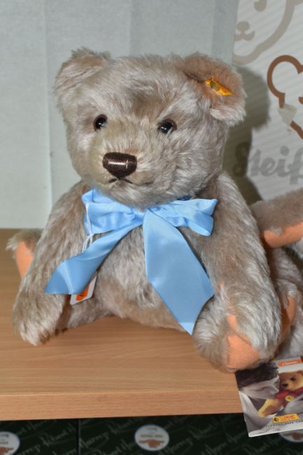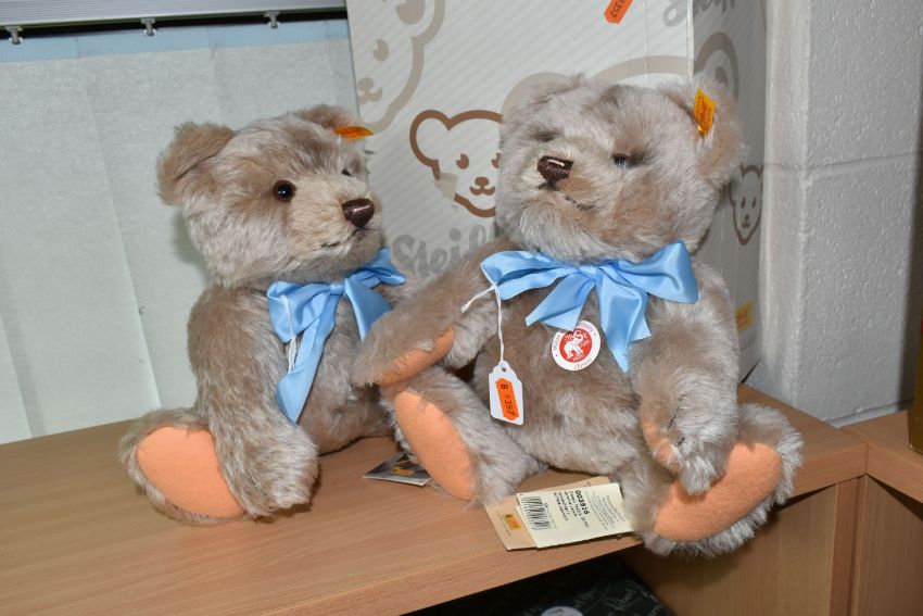 TWO STEIFF 'CLASSIC JACKIE' TEDDY BEARS, no 003516, each fully jointed, with caramel 'fur', apricot pads, blue bow, gold coloured ear button and yellow label, swing tags attached, height 31cm, with one Steiff box (2 + 1 box) (Condition Report: bears appear in good condition with no obvious damage, sd to box)