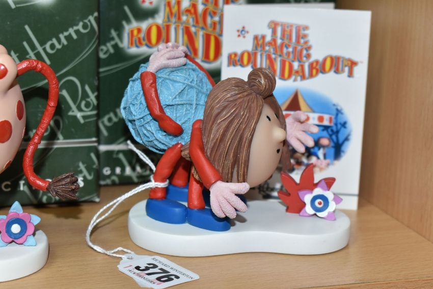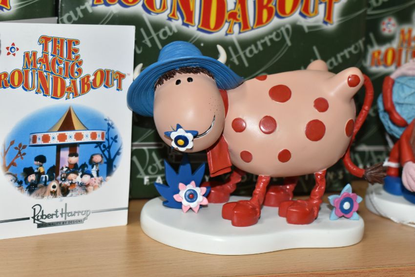 THREE BOXED ROBERT HARROP 'THE MAGIC ROUNDABOUT' SCULPTURES, comprising Zebedee MR03 (crack in plant), Ermintrude MR05 and Penelope the Spider MR10, height of tallest 11cm (3 + 3 boxes) (Condition Report: Ermintrude and Penelope appear in good condition, Zebedee as stated, sd to boxes)