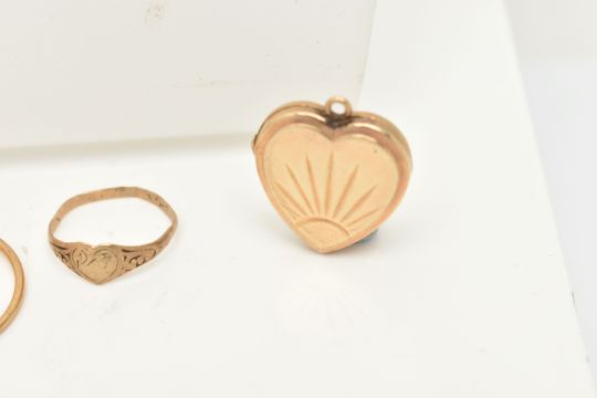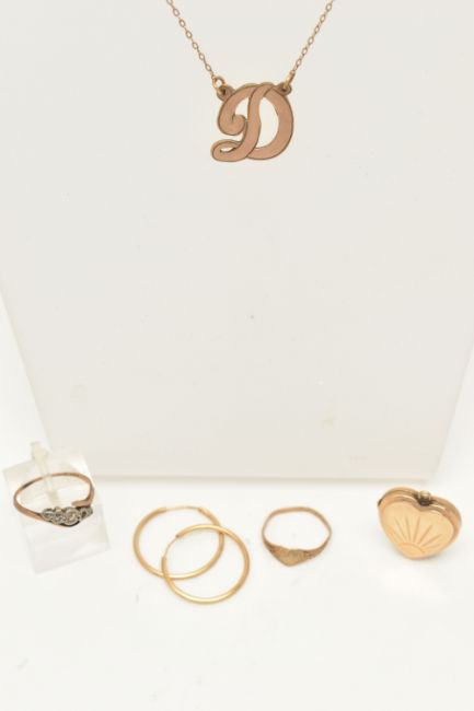 AN ASSORTMENT OF JEWELLERY, to include a 9ct gold heart signet ring, hallmarked 9ct Birmingham, approximate gross weight 0.7 grams, a yellow metal 'D' pendant, suspended from a fine trace chain, stamped 9ct an AF yellow and white metal ring, stamped 9ct, approximate gross weight 3.8 grams, a yellow metal heart locket, stamped 9ct bk & ft, and a pair of rolled gold sleeper hoop earrings (condition report: general moderate wear, overall condition good)