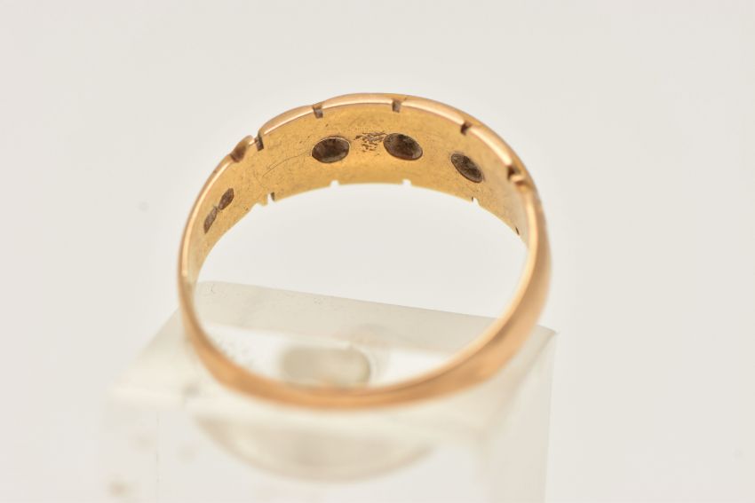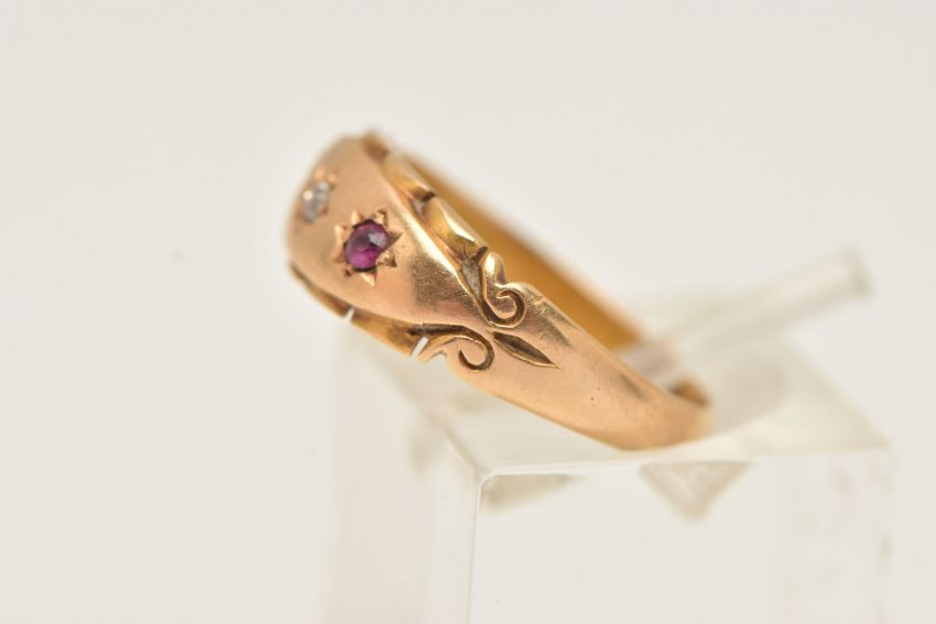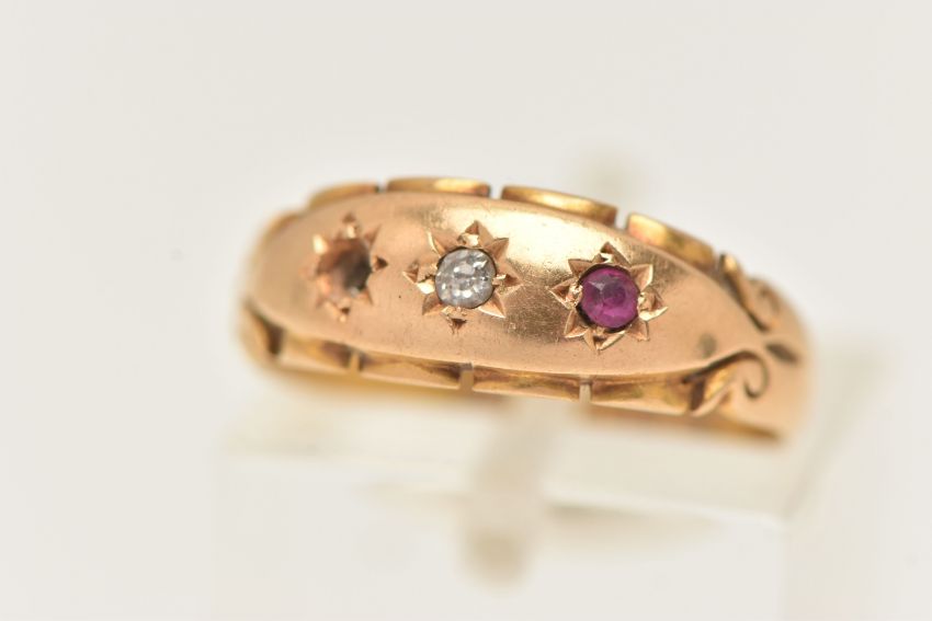 AN EARLY 20TH CENTURY, 18CT GOLD GEM SET RING, three star set mounts set with a central single cut diamond, flanked with a circular cut ruby (one ruby is missing from mount), scroll detail to the shoulders, leading onto a polished band, hallmarked 18ct Birmingham 1902, ring size K, approximate gross weight 3.3 grams (condition report: one stone is missing will require some attention, band slightly misshapen, general wear)