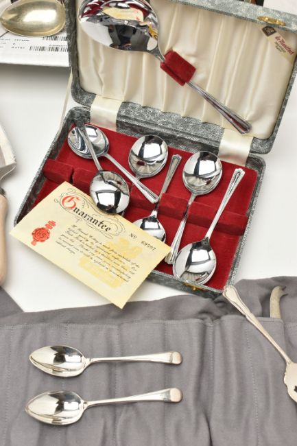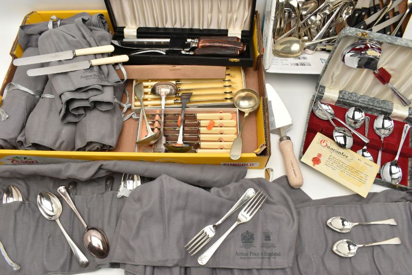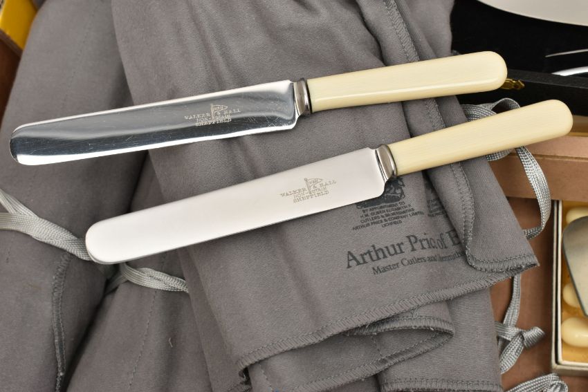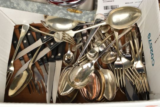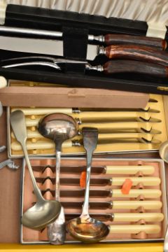 A BOX OF ASSORTED BOXED SETS AND LOOSE CUTLERY, to include a boxed set of six knives each fitted with ivorine handles, another boxed set of six knives with ivorine handles, a cased set of shell shape dessert spoons, a cased three piece meat carving set fitted with antler handles and forged steel, a boxed bread knife, together with a number of EPNS, EP cutlery pieces in cutlery bags, and a box of assorted loose pieces of cutlery etc