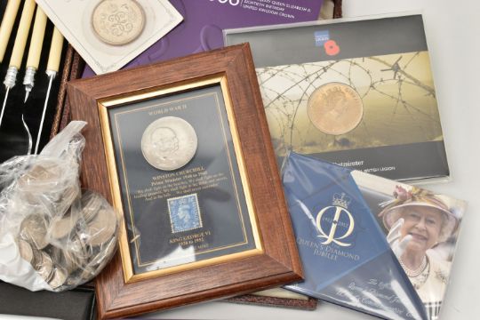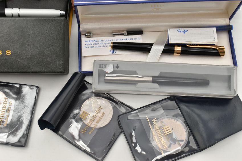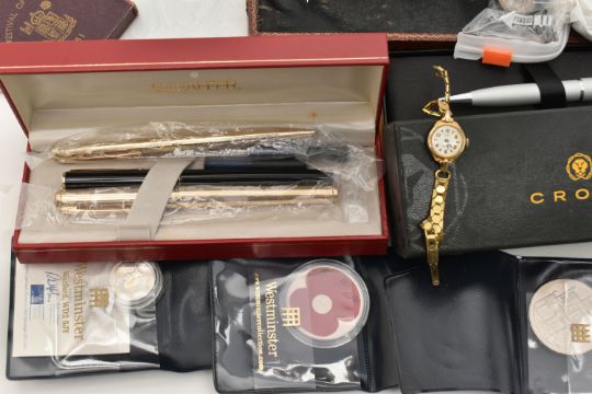 ASSORTED ITEMS, to include a cased set of fish eaters fitted with ivorine handles, a boxed black 'Sheaffer' fountain pen, a gold tone 'Sheaffer' fountain pen and ball point pen, a boxed 'Waterman' fountain pen fitted with an 18k nib with ink cartridge, a boxed 'Parker' fountain pen, a boxed 'Cross' ball point pen, a ladies gold plated wristwatch, with an assortment of coins and commemorative such as a boxed 'Festival of Britain' silver Crown, framed Churchill coin, 1689-1989 commemorative £2 piece, with a quantity of carded commemorative coins, a bag of old British Five Pence coins etc