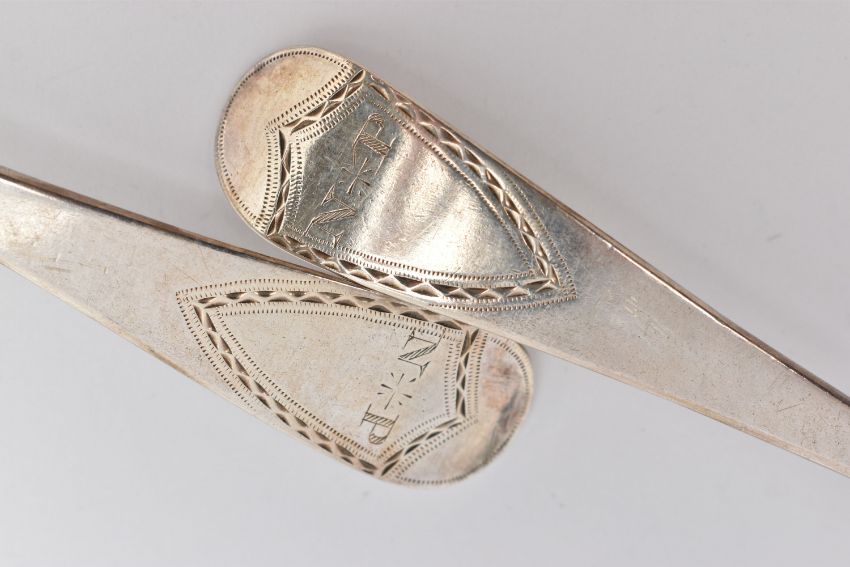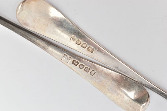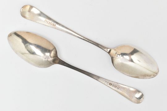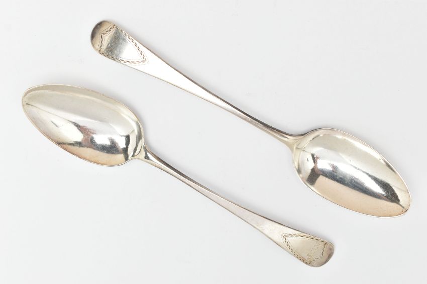 TWO GEORGIAN SILVER TABLE SPOONS, old English pattern spoons with engraved initials to the terminals, rubbed sponsors marks, hallmarked London 1788, length 21.8cm, approximate gross weight 130.0 grams, 4.18 ozt (condition report: general wear in keeping with age)