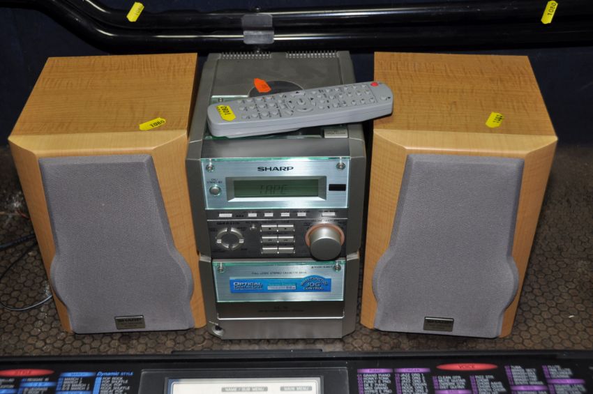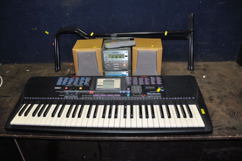 A SHARP XL-70 MINI HI FI WITH MATCHING SPEAKERS and remote (PAT pass and working) along with a Yamaha PSR220 keyboard (no power supply so UNTESTED) and a keyboard stand (5)