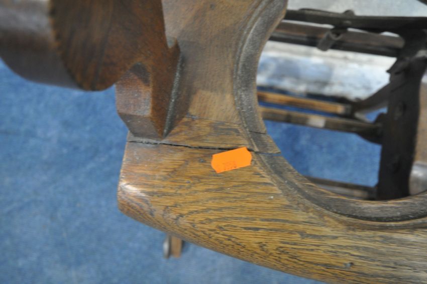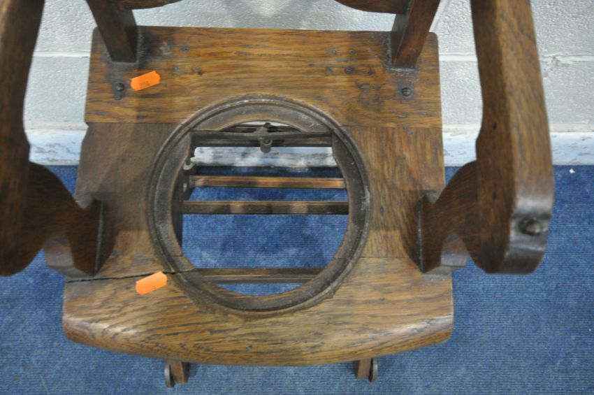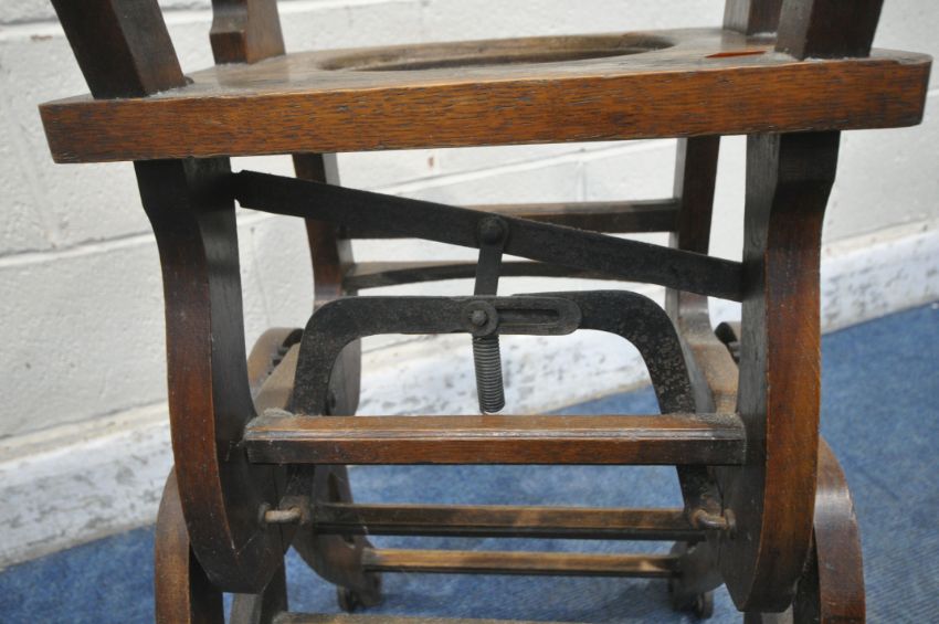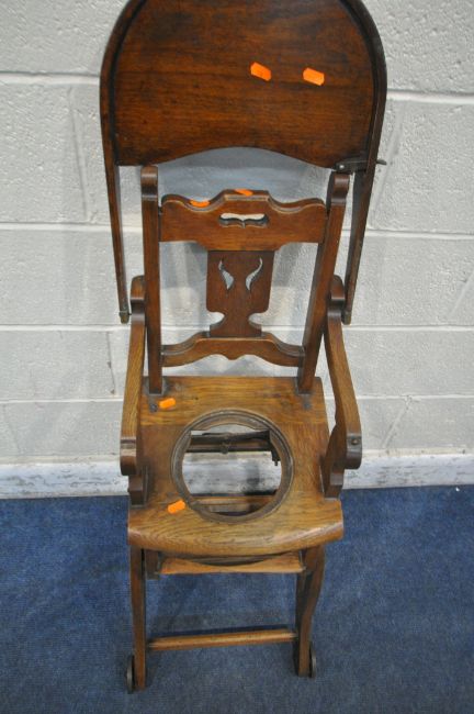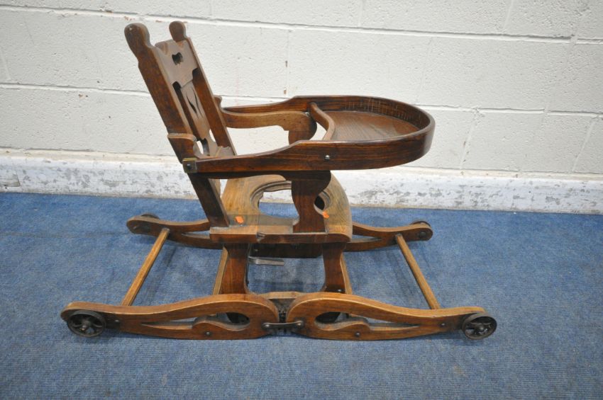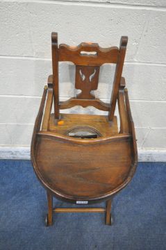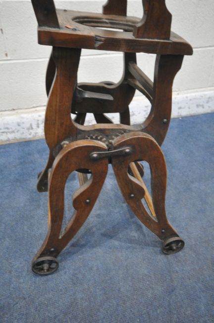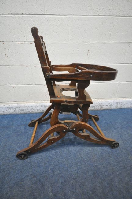 A VINTAGE CHILDS METAMORPHIC HIGH CHAIR, with a fold over tray table, width 35cm x depth 60cm x height 99cm (condition report: mechanism working, missing pot for seat, historical cracks, general signs of wear and usage)
