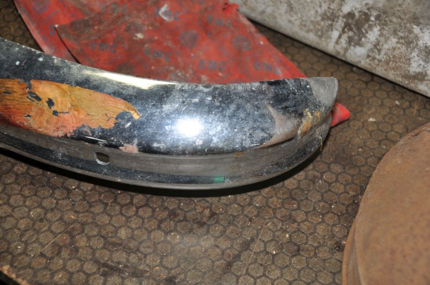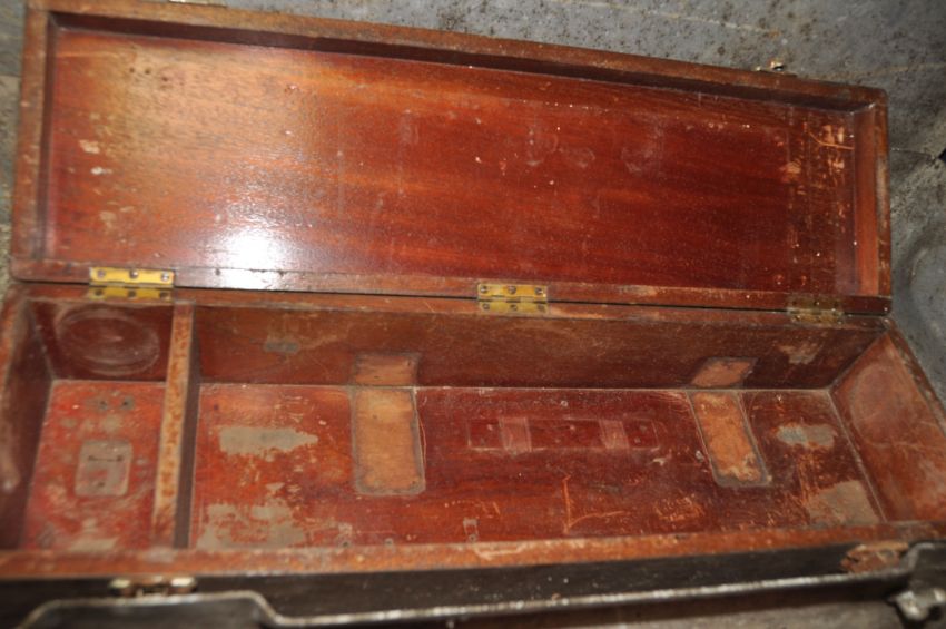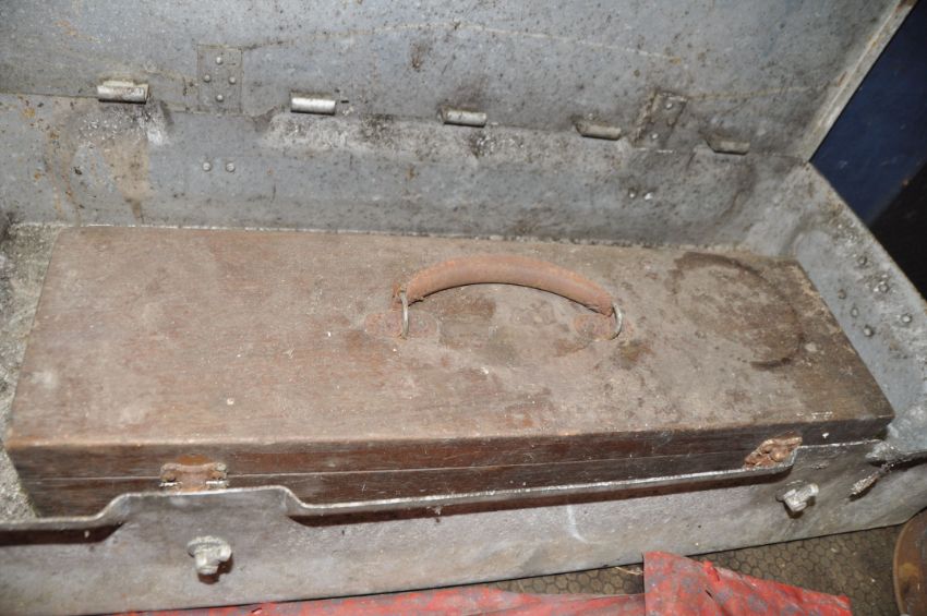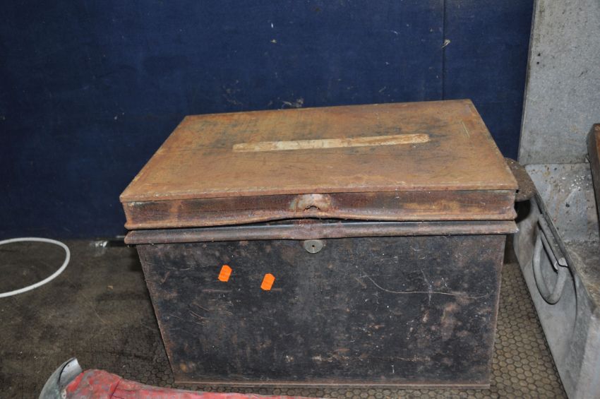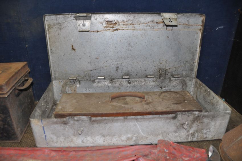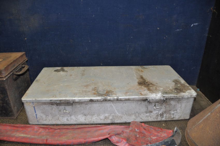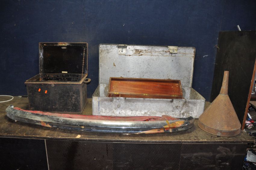 AN ALUMINIUM 'AMMO' BOX width 88cm depth 40cm height 16cm, a deed box (lock broken in), a wooden instrument case, a vintage BMC Bumper Bar Cat No IH5585/0/4000 and a large metal funnel (5)