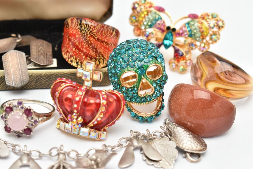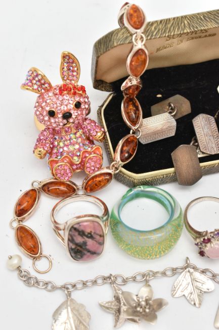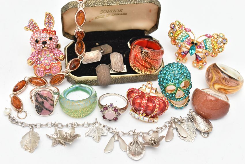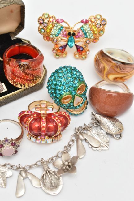 FIVE 'BUTLER AND WILSON' RINGS AND OTHER ITEMS, rings to include a butterfly, skull, crown and rabbit ring each signed to the reverse 'Butler & Wilson', together with three glass rings, a white metal rhodonite ring stamped 925, a white metal cluster ring stamped 925, a white metal goldstone ring stamped 925, a white metal amber set line bracelet fitted with a folding clasp stamped 925, a silver charm bracelet fitted with a lobster clasp, hallmarked Birmingham, and a boxed pair of silver chain link cufflinks, hallmarked Birmingham