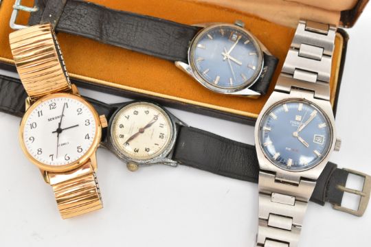 FOUR GENTS WRISTWATCHES, to include a 'Tissot, PR 5/6' manual wind watch, round blue dial with baton markers and date window at the three o'clock position, fitted with a stainless steel bracelet, currently working, a boxed 'Excalibur' automatic wristwatch, round blue dial with baton markers with date window at the three o'clock position, stainless steel case, fitted with a black strap with a white metal ardillon buckle, a 'Sekonda', with a stretch link bracelet, and a base metal 'Incabloc' wristwatch with a round silvered dial with baton markers, fitted with a black strap and base metal ardillon buckle (condition report: all watches are currently ticking at time of cataloguing although time keeping is untested, we cannot guarantee the working order of any watch)