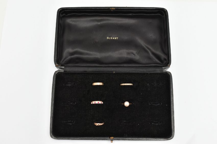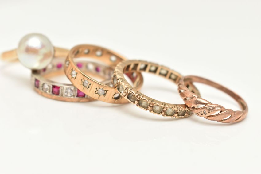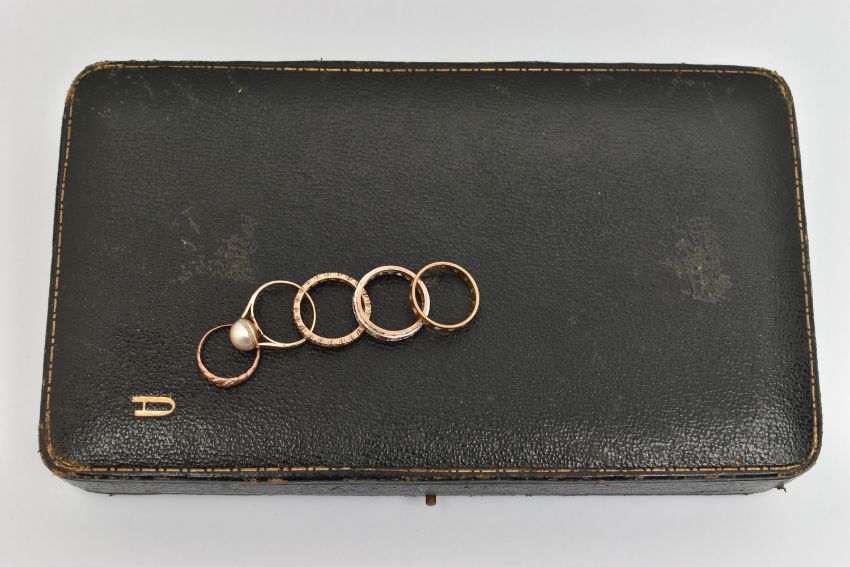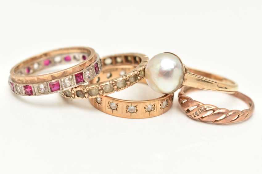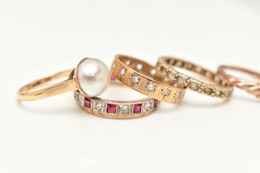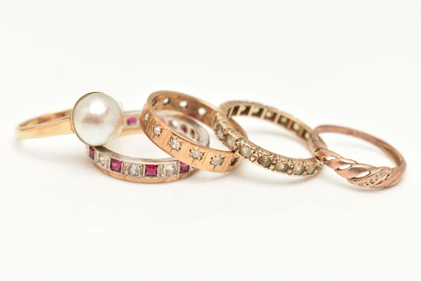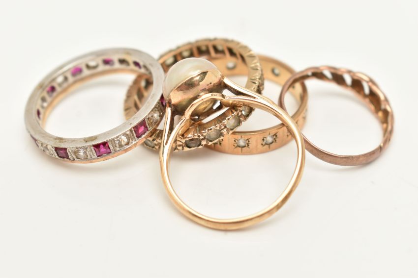 FIVE RINGS AND A RING BOX, to include a yellow metal split pearl ring, stamped 9ct, ring size K, a small rose metal open work ring set with a single cut diamond, stamped 9ct, ring size H, a yellow metal full set colourless spinel eternity ring, stamped 9ct, ring size M, approximate gross weight 7.1 grams, and a 9ct yellow and white gold band set with rubies and colourless cubic zirconia, partial 9ct gold hallmark, ring size M 1/2, approximate weight 2.8 grams, together with a multi storage black ring box