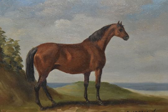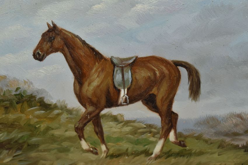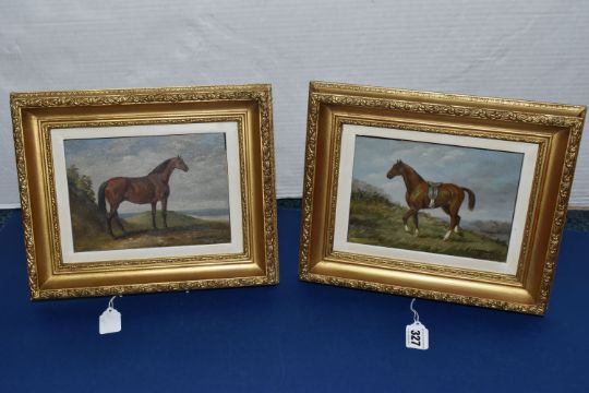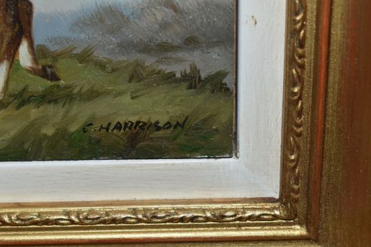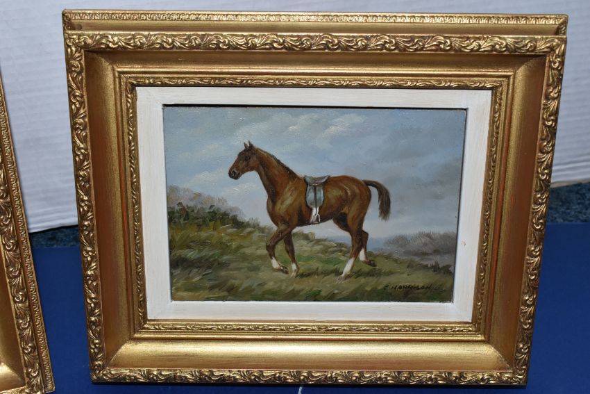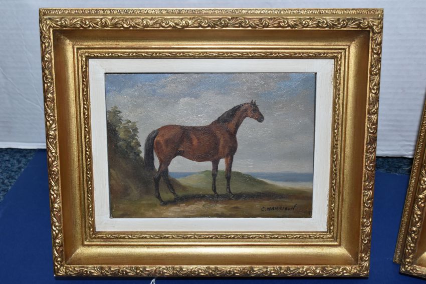 C.HARRISON (20TH CENTURY) TWO EQUINE PORTRAITS, the first depicting a horse with a saddle, signed bottom right, oil on board, approximate size 13cm x 18cm, the second depicts a brown horse without a saddle, signed bottom right, Condition Report: the saddled horse picture is lightly marked to the surface of the painting