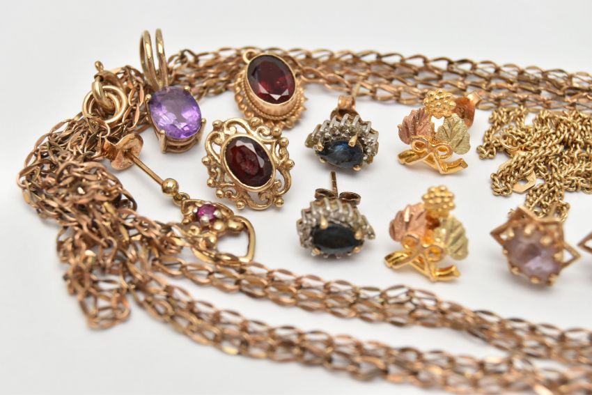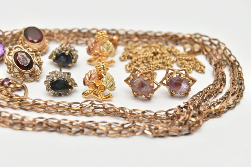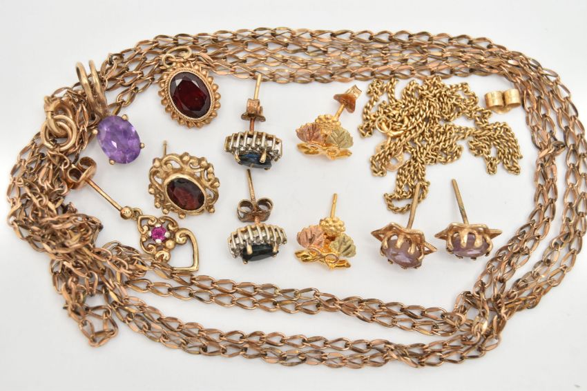 A SELECTION OF JEWELLERY, to include two chain necklaces, three pairs of stud earrings, two single earrings, two pendants, most with marks to indicate 9ct gold, approximate total weight 17 grams