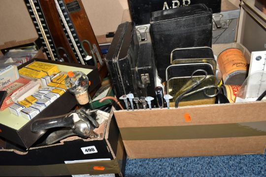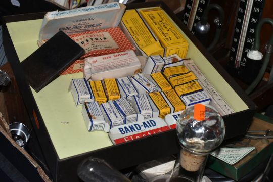 TWO BOXES AND LOOSE VINTAGE MEDICAL ITEMS, to include dressing in the wrappers/box, two vintage baumanometer blood pressure devices in wooden case, vintage stethoscopes, three metal first aid cases, Elastoplast Doctors set one empty one with some items still in, Coldlight otoscope ophthalmoscope end diagnostic set, etc.