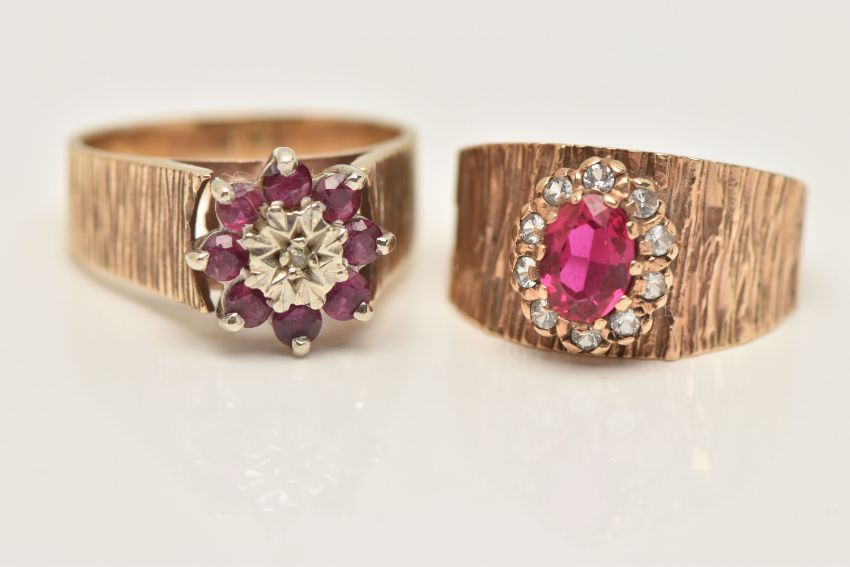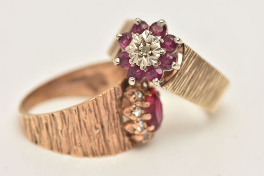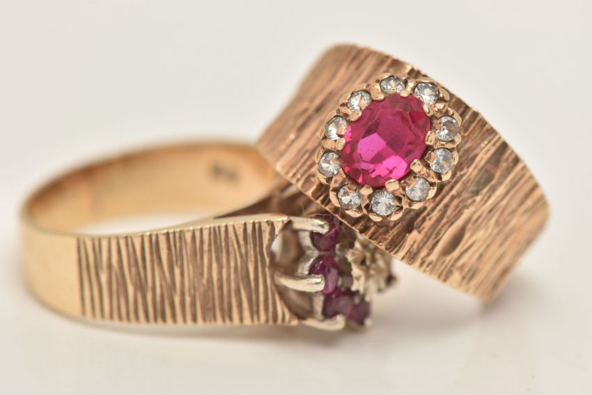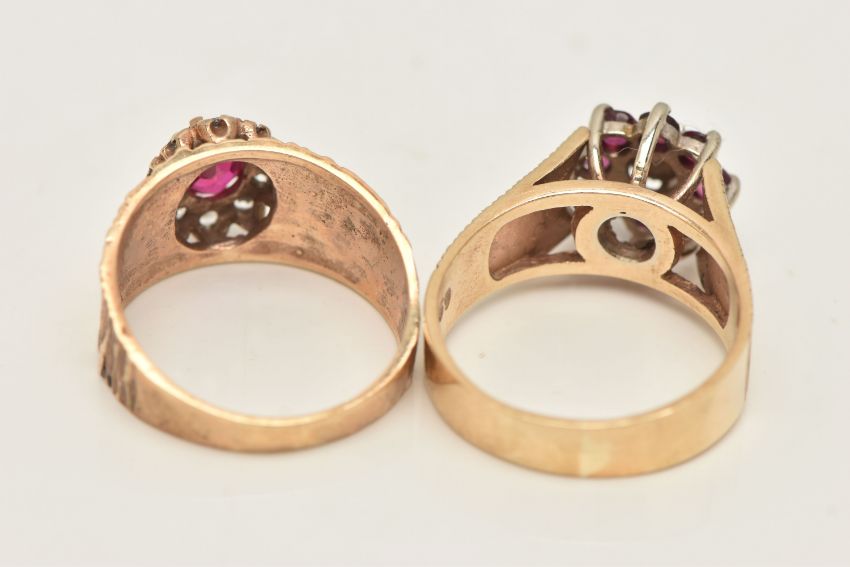 TWO 9CT GOLD GEM SET RINGS, the first an oval cut synthetic ruby and colourless cubic zirconia cluster ring, to a tapering bark effect band, hallmarked 9ct Birmingham, ring size N 1/2, the second a ruby and illusion set single cut diamond cluster ring, textured shoulders leading on to a polished band, hallmarked 9ct Birmingham, ring size O, approximate gross weight 9.4 grams (condition report: both would benefit from a gentle clean, stones intact at time of cataloguing, overall condition good)