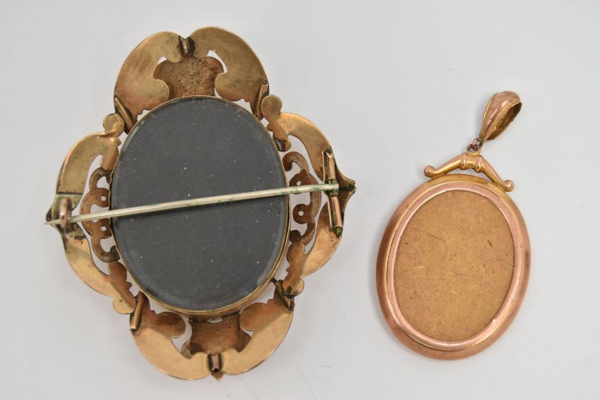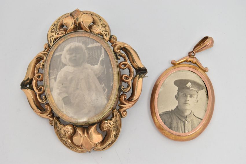 AN EARLY 20TH CENTURY PHOTO PENDANT AND A BROOCH, a yellow metal double sided photo pendant, fitted with a large tapered bail, stamped 9ct, approximate gross weight including photo 3.1 grams, together with a rolled gold memorial brooch (condition report: general moderate wear, glass missing from pendant, wear to brooch)