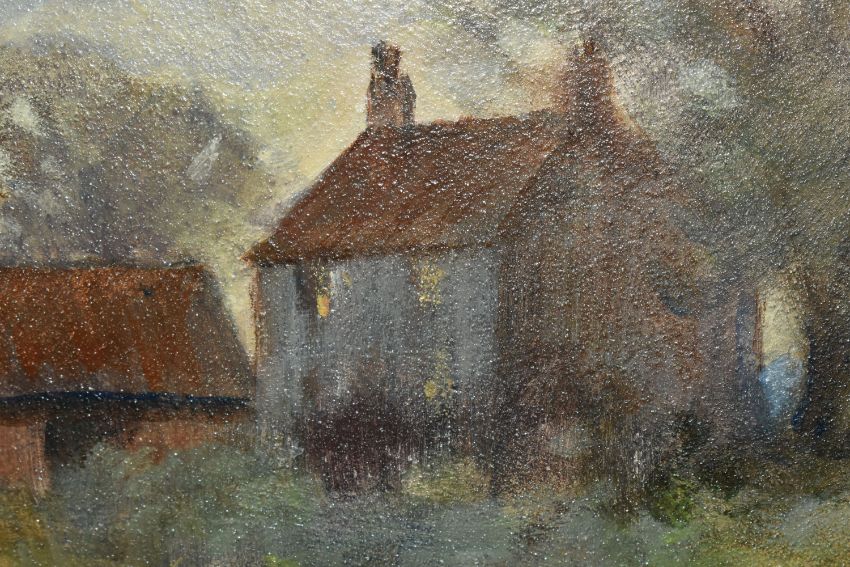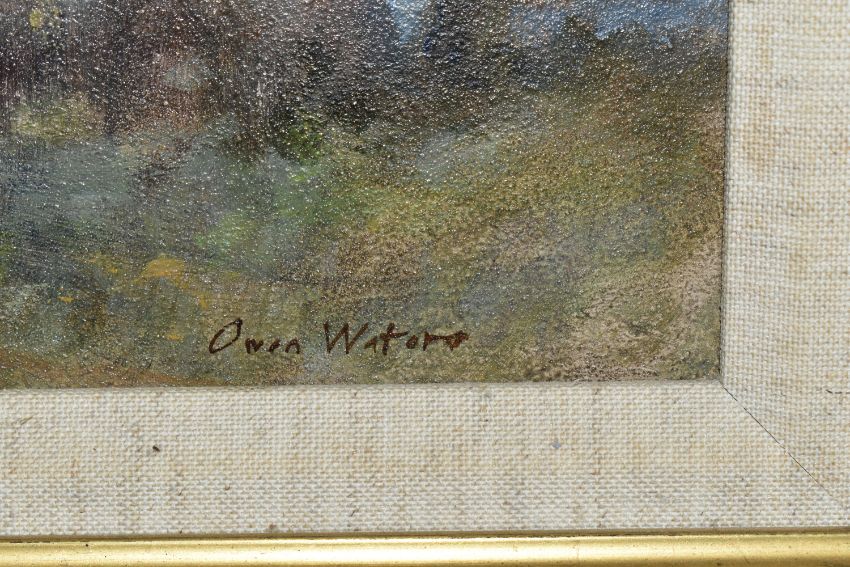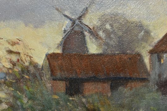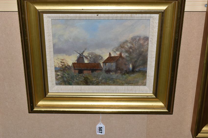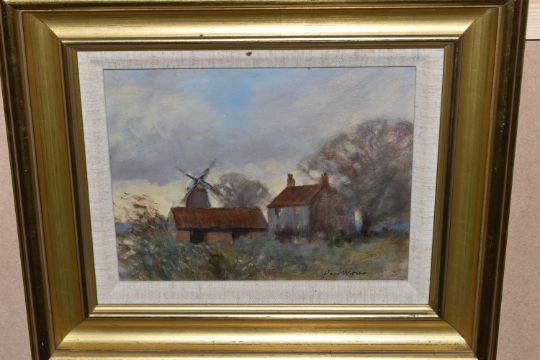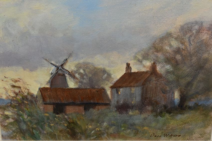 OWEN WATERS (BRITISH 1916-2004) 'CLIPPESBY MILL, NORFOLK', an impressionist style landscape with cottage, outbuildings and windmill, signed bottom right, titled verso, oil on canvas, approximate size 19cm x 24cm, frame size 34cm x 39cm, Condition Report: frame marked in places (artist resale rights apply)