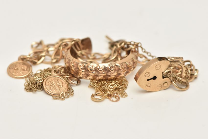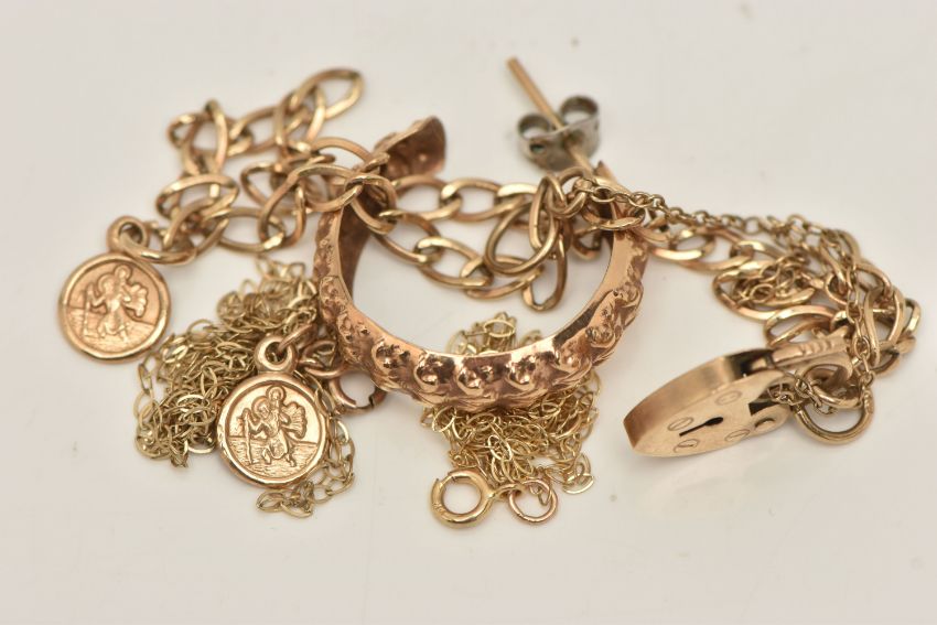 A SMALL ASSORTMENT OF YELLOW METAL JEWELLERY, to include a curb link bracelet, fitted with a heart padlock clasp and safety chain with a St. Christopher charm, stamped 375, length 200mm, two tangled fine trace chains with spring clasps, one with a small St. Christopher pendant, and a single yellow metal half hoop earring, approximate gross weight 5.2 grams (condition report: chains tangled will require some attention)