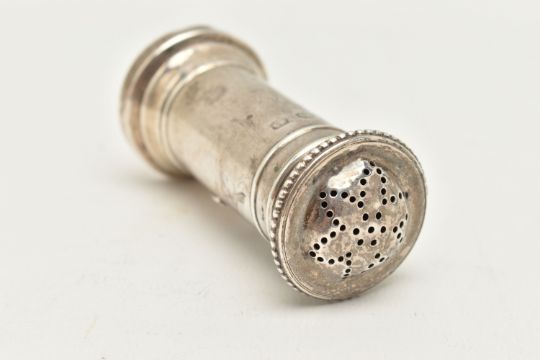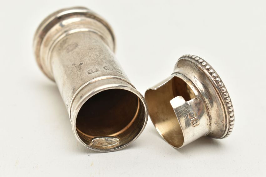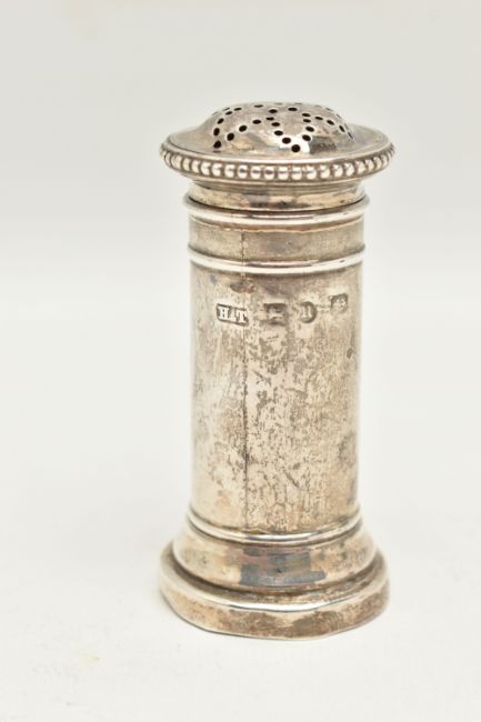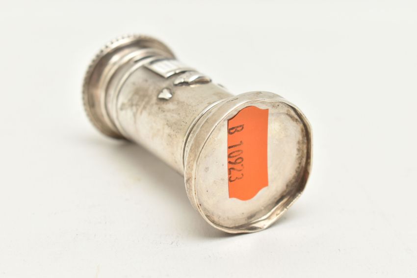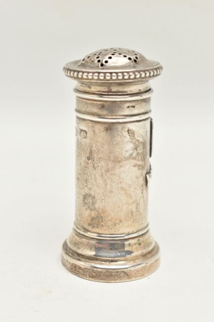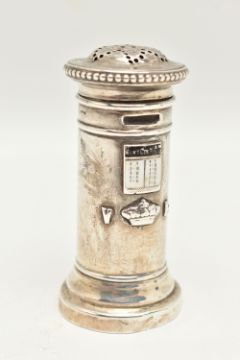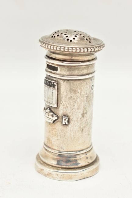 A VICTORIA SILVER NOVELTY PEPPERETTE, designed as a novelty miniature post box, approximate height 76mm, hallmarked Hilliard & Thomason Birmingham 1894, approximate gross weight 41.2 grams, 1.32 ozt, (condition report; general moderate wear, some rubbing to hallmark, some indenting to the lid and base, some minor enamel damage, overall condition good)